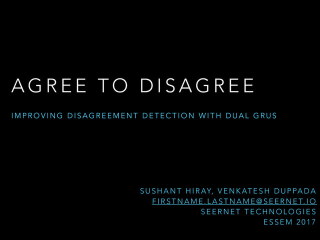 Presentation of our work on disagreement detection at ESSEM 2017. In this work, we show that by using a Siamese inspired architecture to encode the discussions, we no longer need to rely on hand-crafted features to exploit the meta thread structure. The research paper can be found at https://arxiv.org/abs/1708.05582