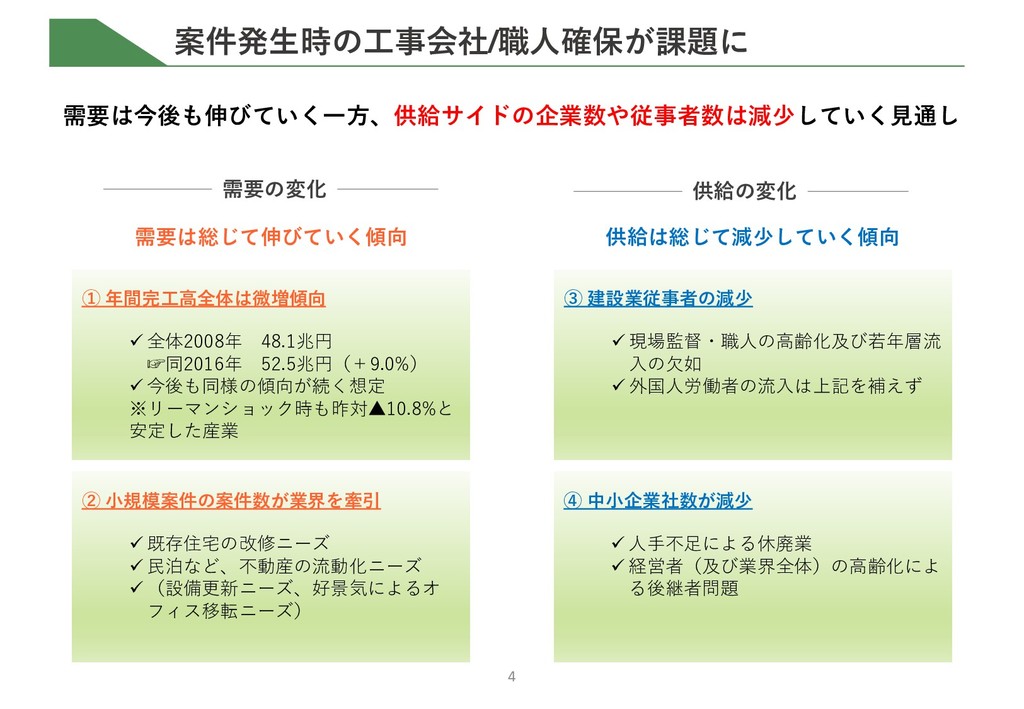 全体2008年 48.1兆円 ☞同2016年 52.5兆円(+9.0%) ü 今後も同様の傾向が続く想定 ※リーマンショック時も昨対▲10.8%と 安定した産業 ② ⼩規模案件の案件数が業界を牽引 ü 既存住宅の改修ニーズ ü ⺠泊など、不動産の流動化ニーズ ü (設備更新ニーズ、好景気によるオ フィス移転ニーズ) ③ 建設業従事者の減少 ü 現場監督・職⼈の⾼齢化及び若年層流 ⼊の⽋如 ü 外国⼈労働者の流⼊は上記を補えず ④ 中⼩企業社数が減少 ü ⼈⼿不⾜による休廃業 ü 経営者(及び業界全体)の⾼齢化によ る後継者問題