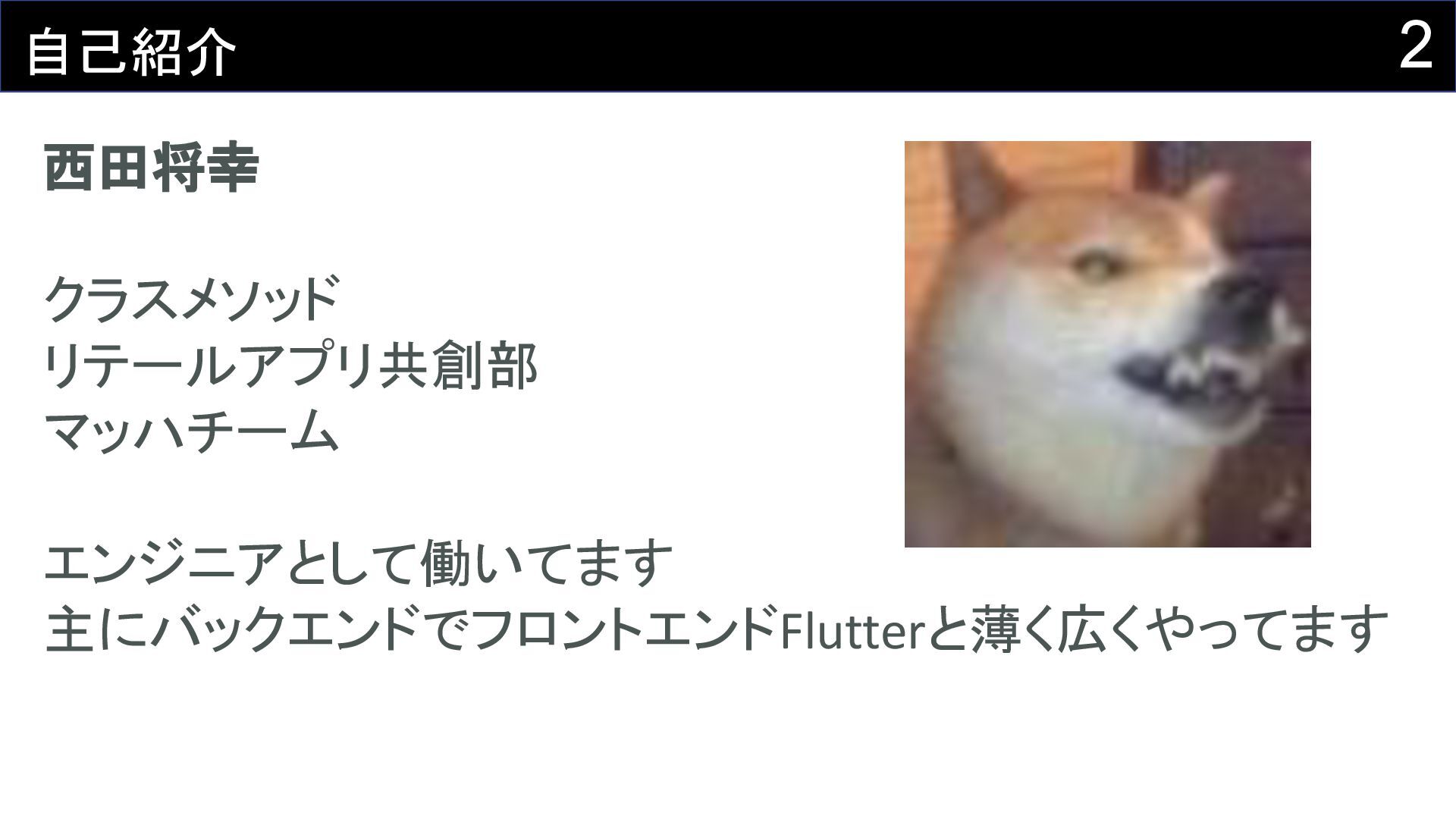 2 自己紹介 西田将幸 クラスメソッド リテールアプリ共創部 マッハチーム エンジニアとして働いてます 主にバックエンドでフロントエンドFlutterと薄く広くやってます