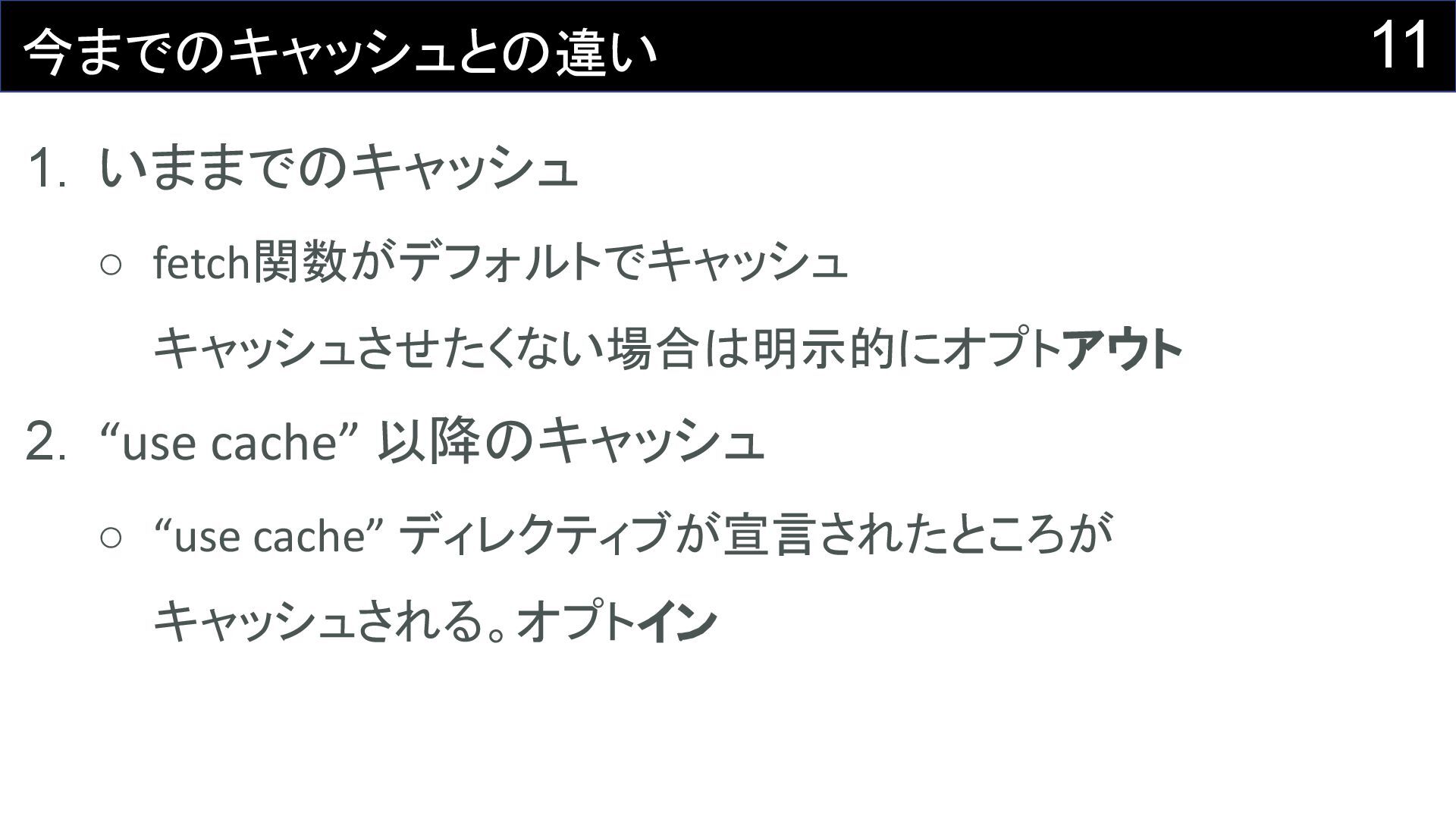 11 今までのキャッシュとの違い 1. いままでのキャッシュ ◦ fetch関数がデフォルトでキャッシュ キャッシュさせたくない場合は明示的にオプトアウト 2. “use cache”