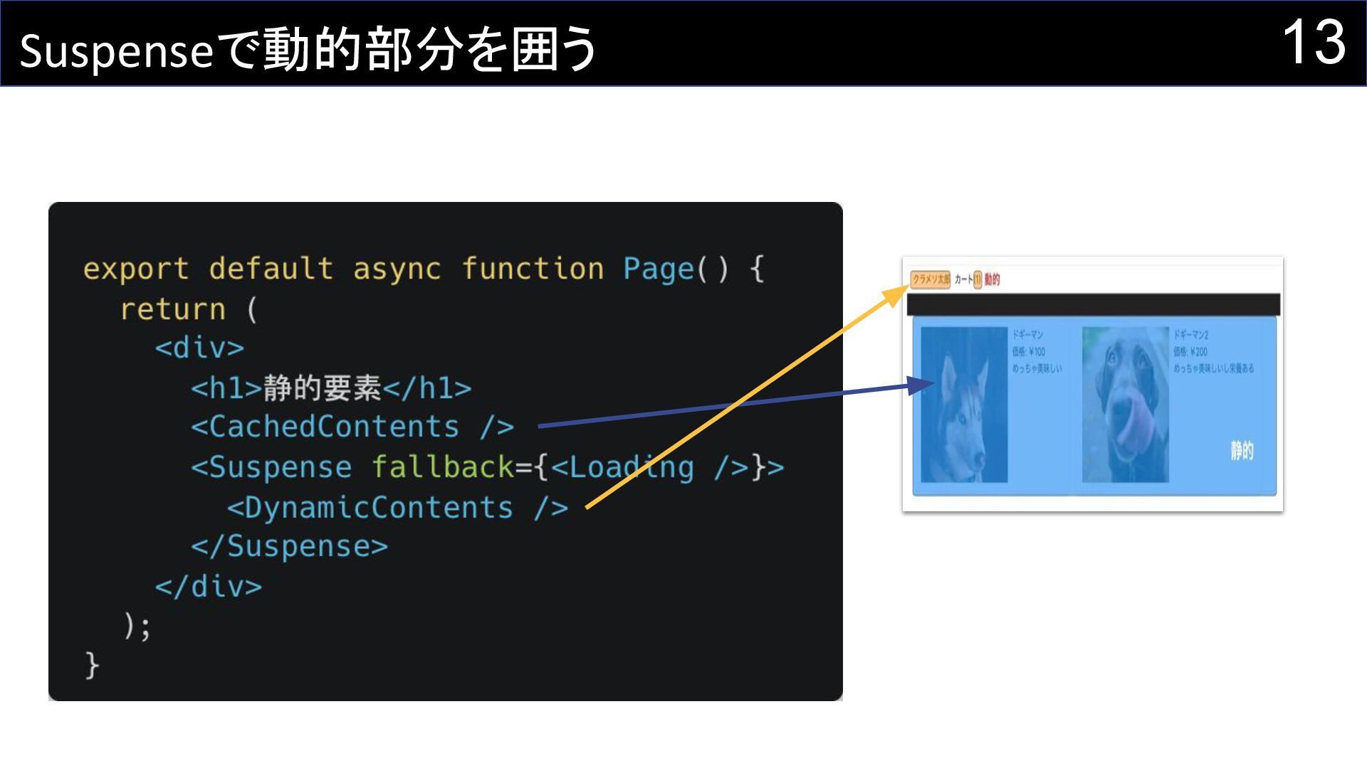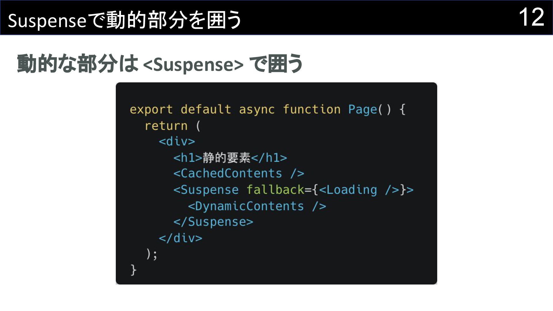 12 Suspenseで動的部分を囲う 動的な部分は <Suspense> で囲う