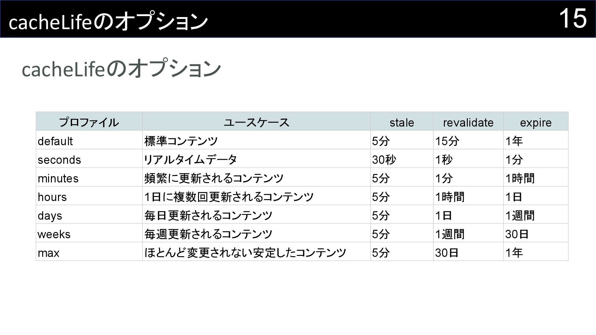 15 cacheLifeのオプション cacheLifeのオプション プロファイル ユースケース stale revalidate expire default 標準コンテンツ