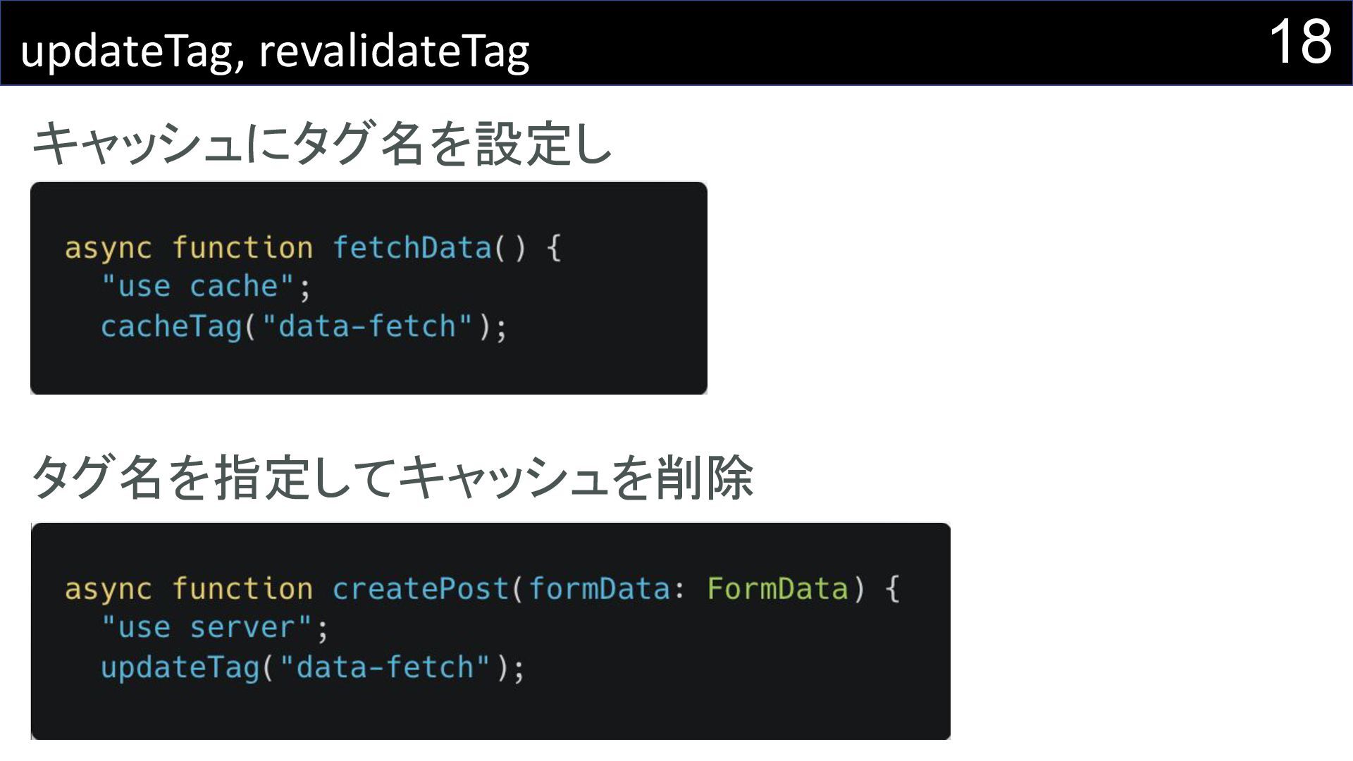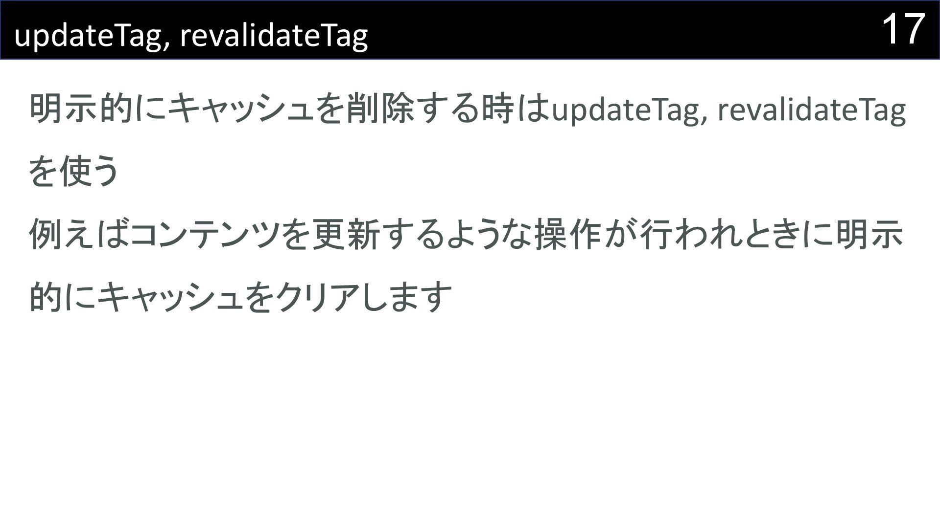 17 updateTag, revalidateTag 明示的にキャッシュを削除する時はupdateTag, revalidateTag を使う 例えばコンテンツを更新するような操作が行われときに明示 的にキャッシュをクリアします