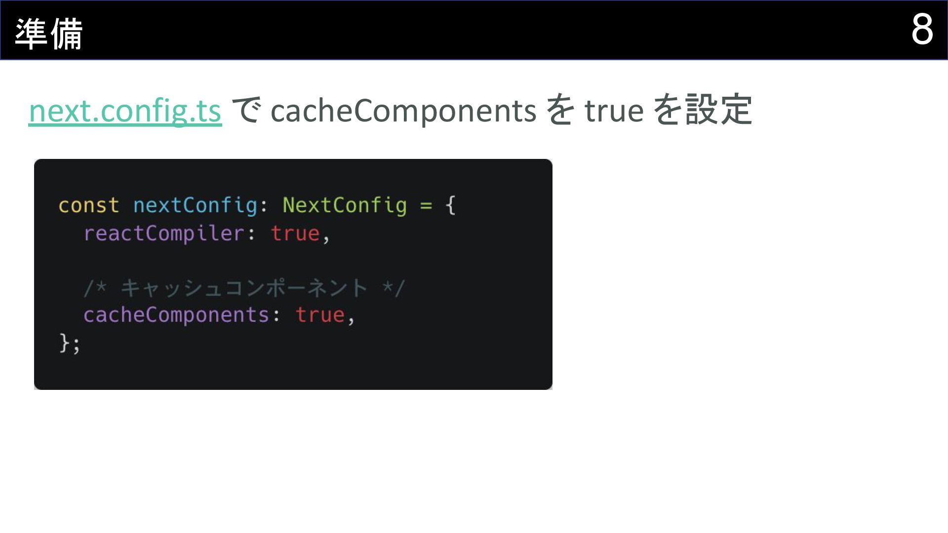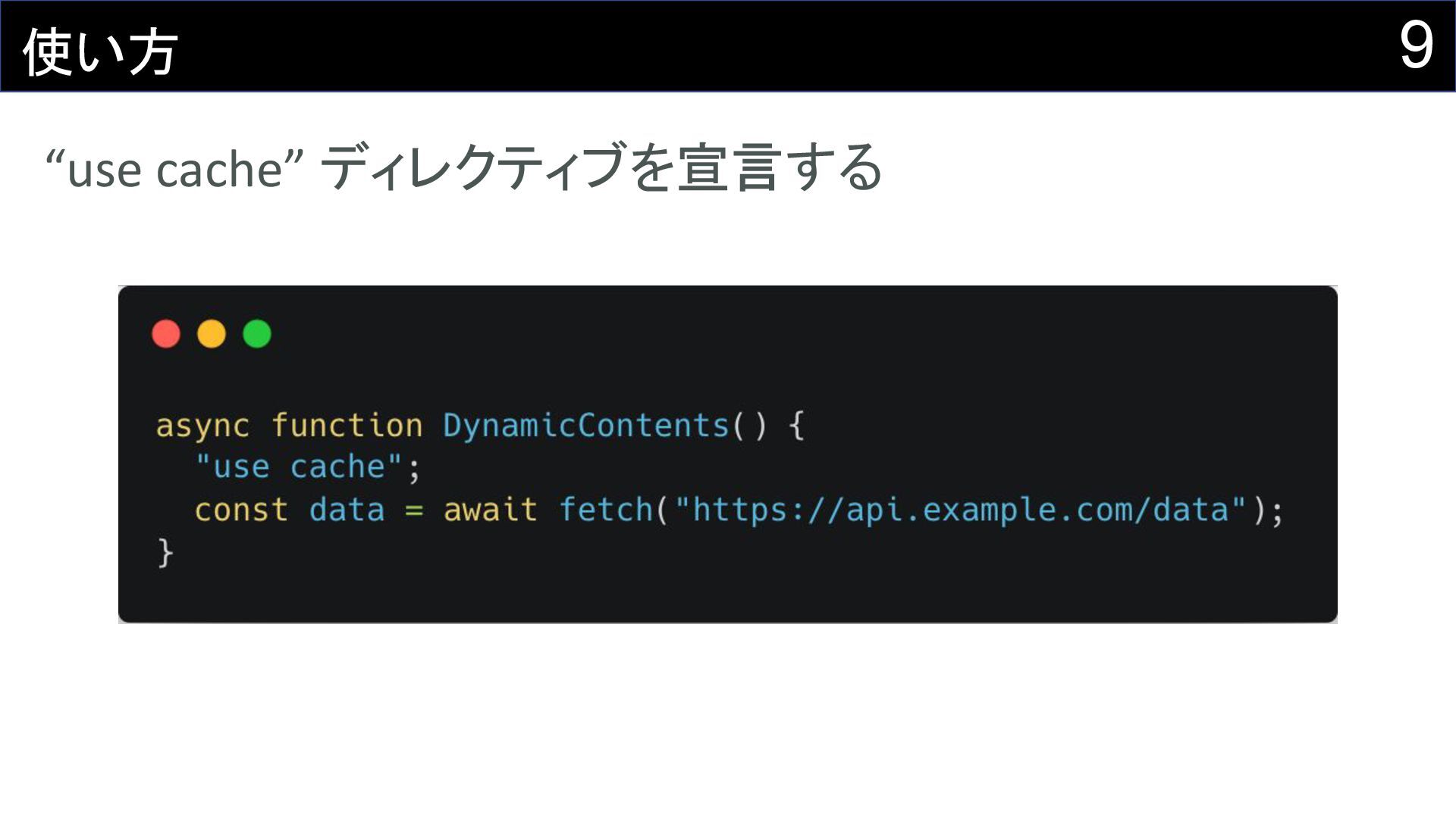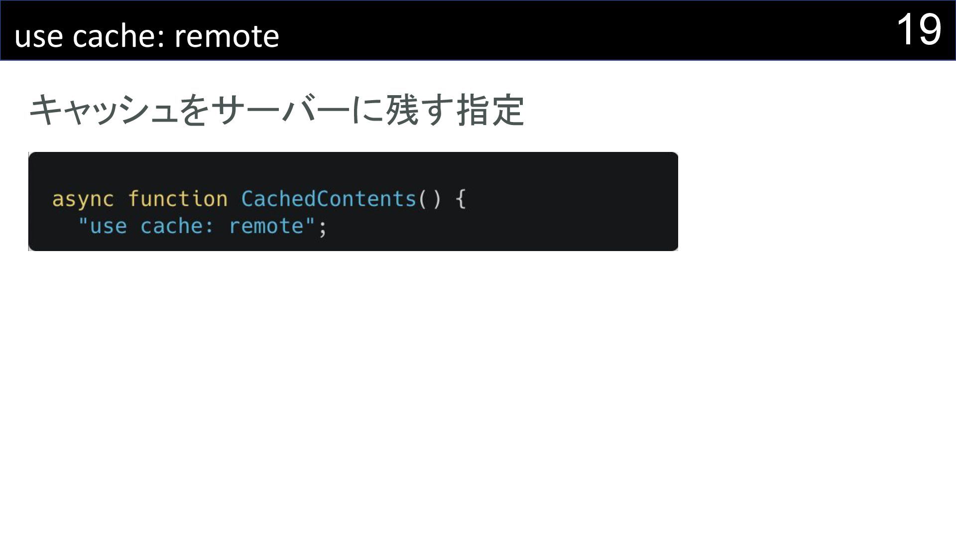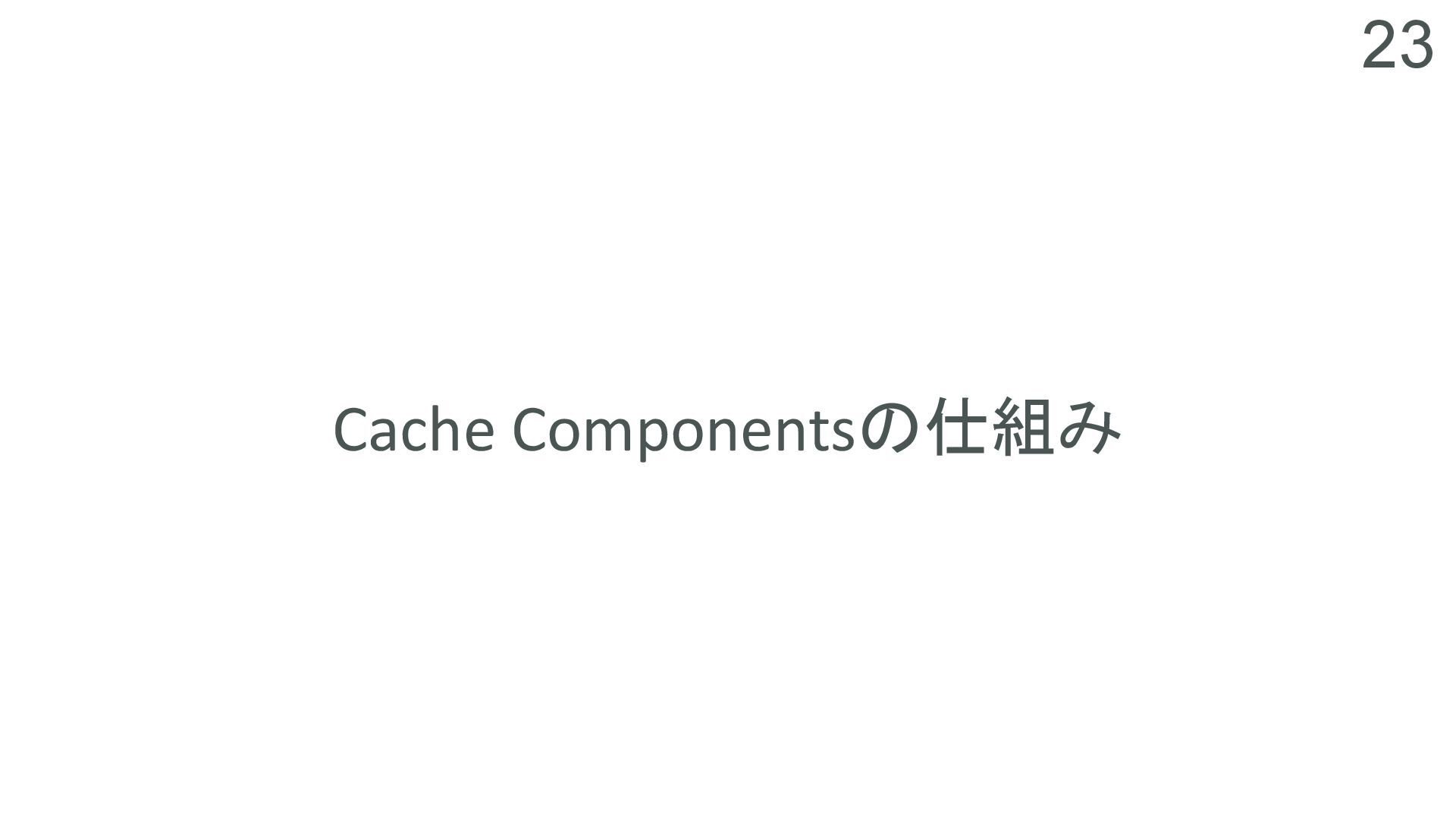 以降のキャッシュ ◦ “use cache” ディレクティブが宣言されたところが キャッシュされる。オプトイン