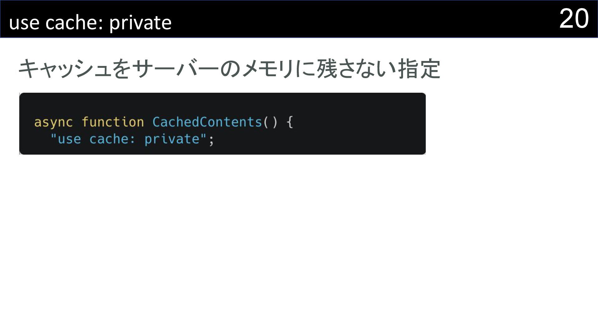 20 use cache: private キャッシュをサーバーのメモリに残さない指定
