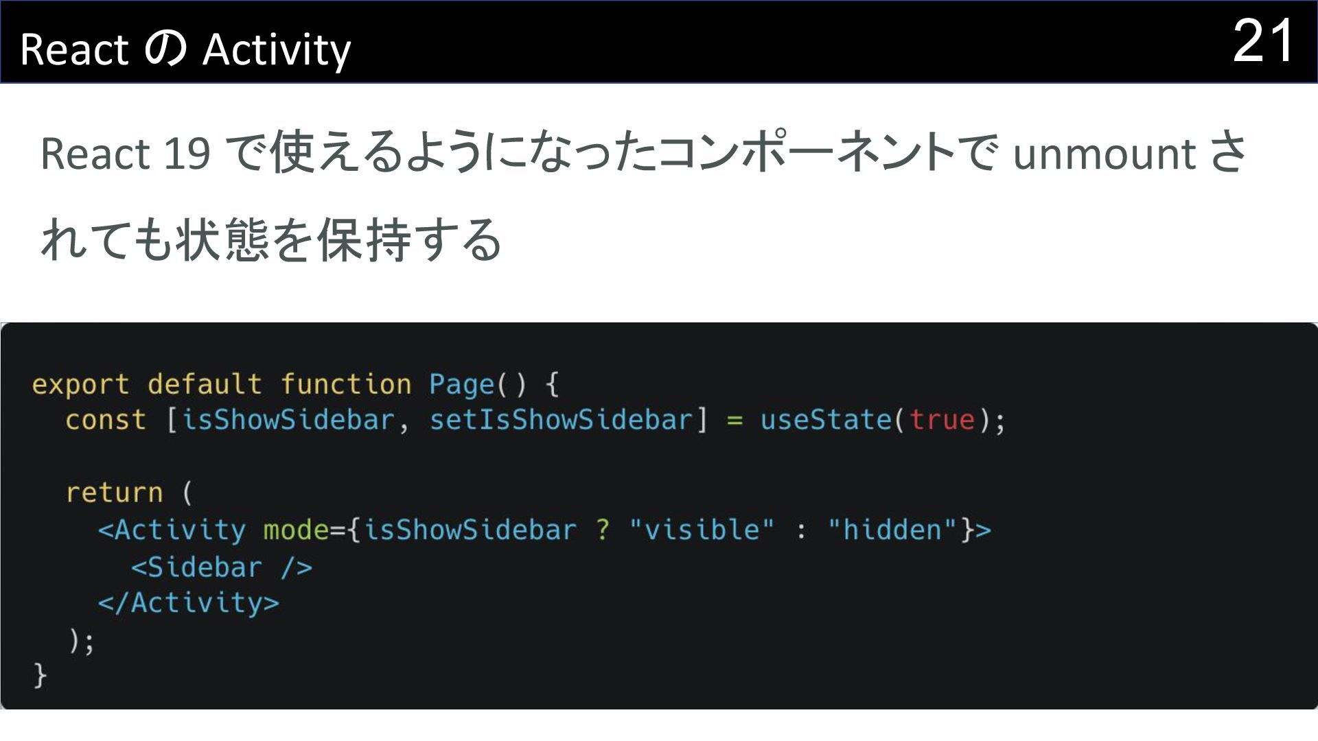 21 React の Activity React 19 で使えるようになったコンポーネントで unmount さ れても状態を保持する