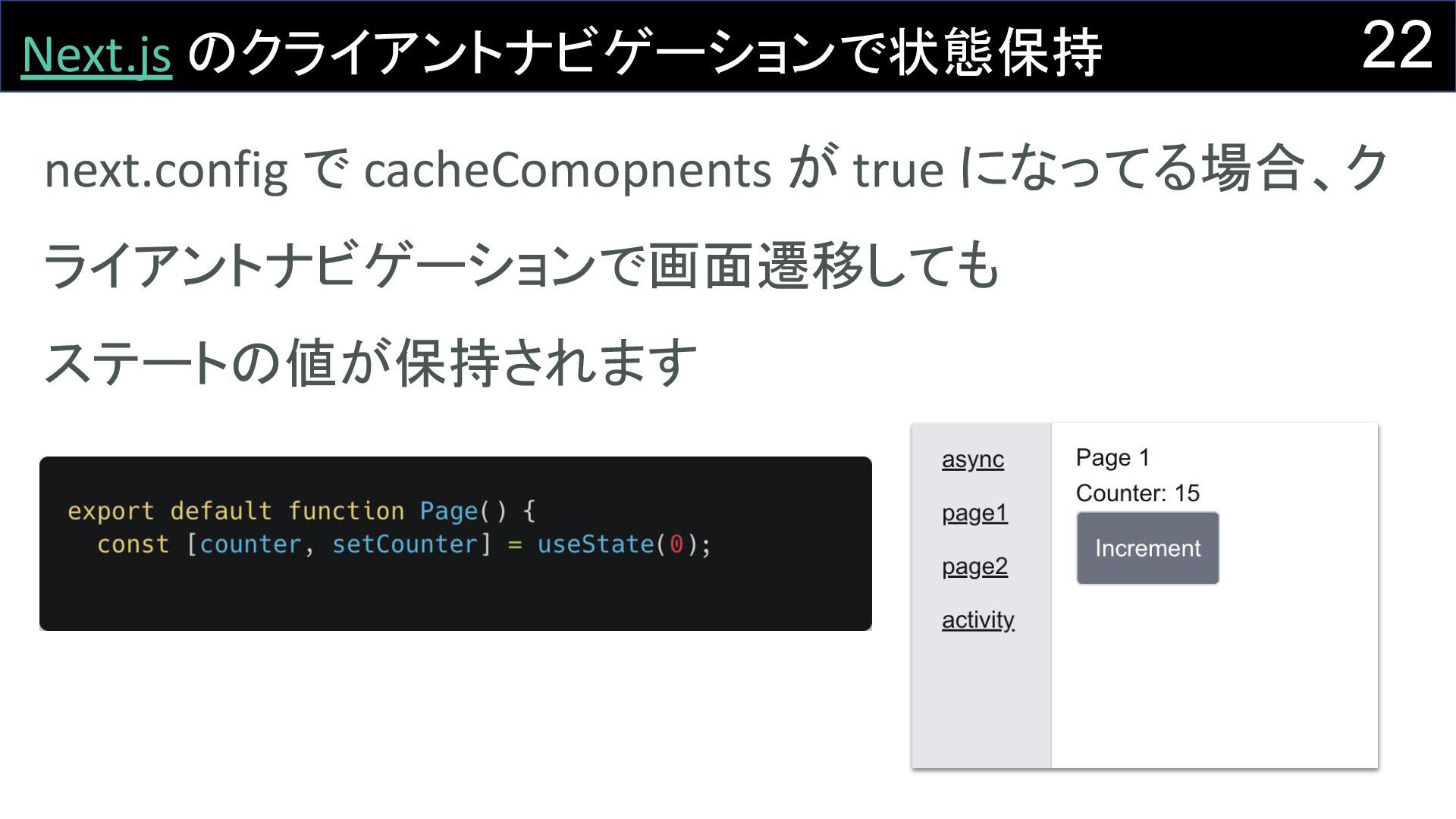 22 Next.js のクライアントナビゲーションで状態保持 next.config で cacheComopnents が true になってる場合、ク ライアントナビゲーションで画面遷移しても