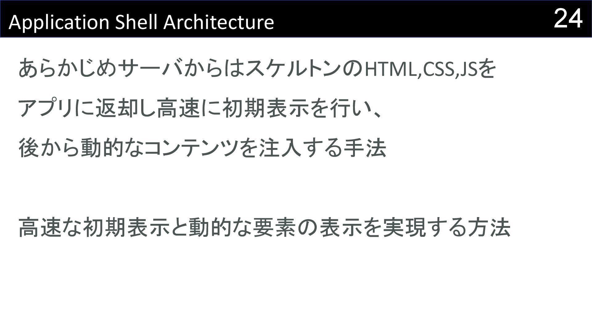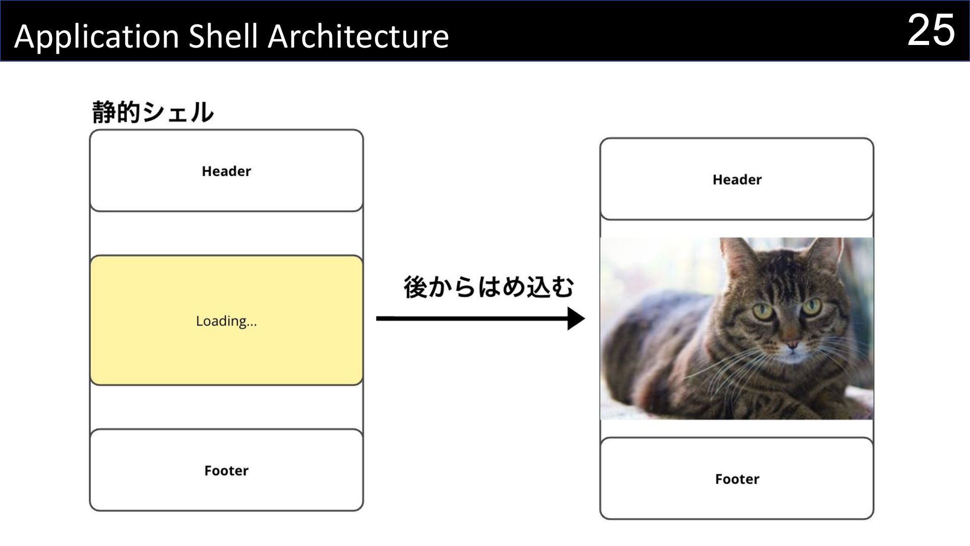 24 Application Shell Architecture あらかじめサーバからはスケルトンのHTML,CSS,JSを アプリに返却し高速に初期表示を行い、 後から動的なコンテンツを注入する手法 高速な初期表示と動的な要素の表示を実現する方法