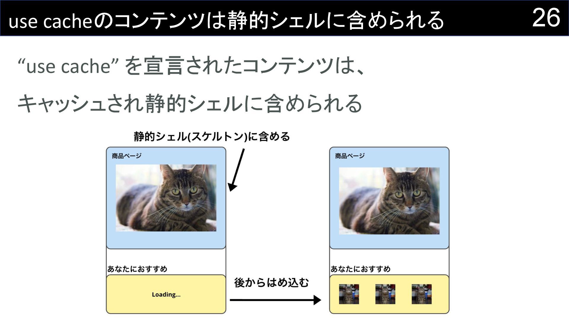 26 use cacheのコンテンツは静的シェルに含められる “use cache” を宣言されたコンテンツは、 キャッシュされ静的シェルに含められる