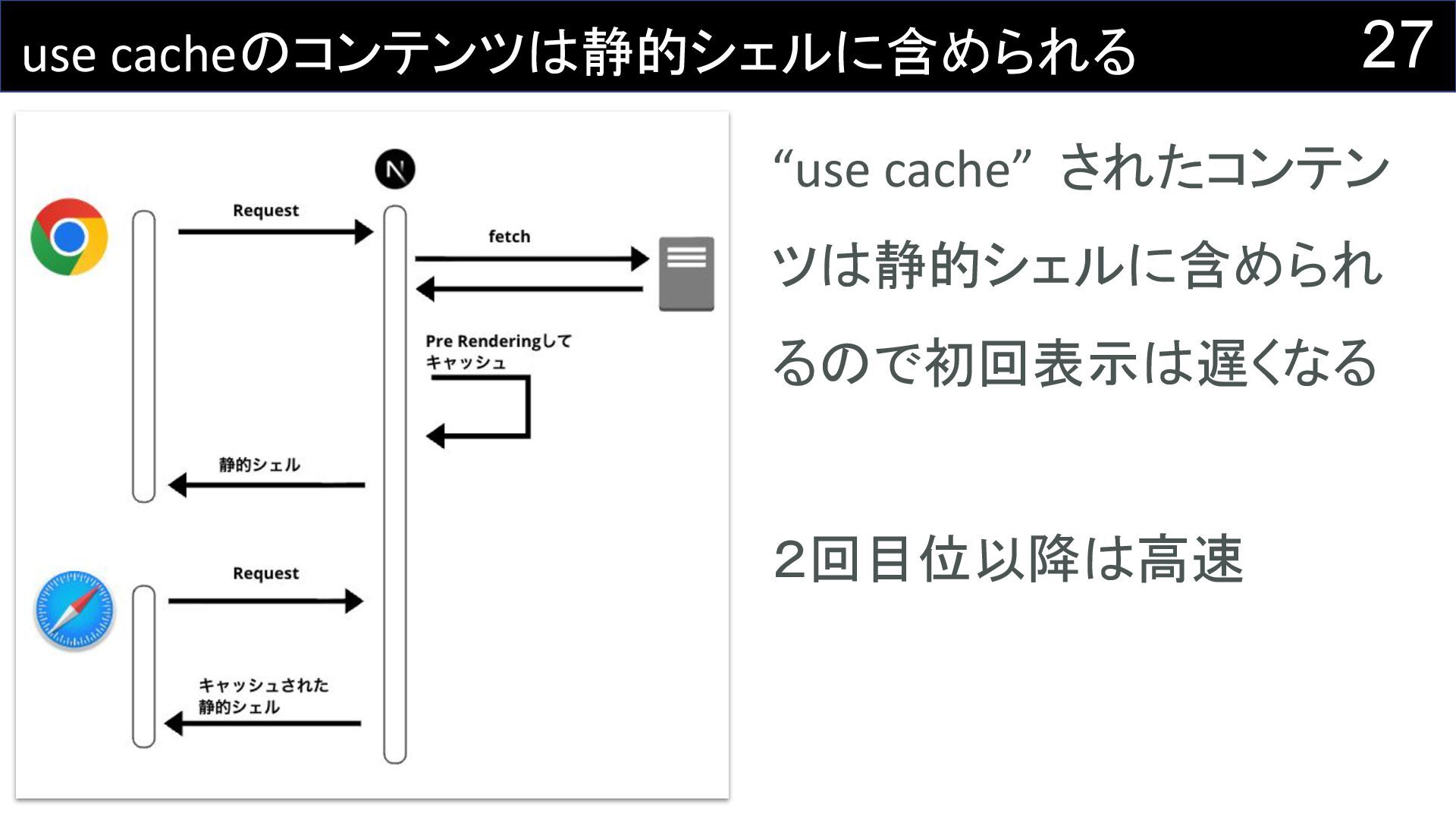 27 use cacheのコンテンツは静的シェルに含められる “use cache” されたコンテン ツは静的シェルに含められ るので初回表示は遅くなる 2回目位以降は高速