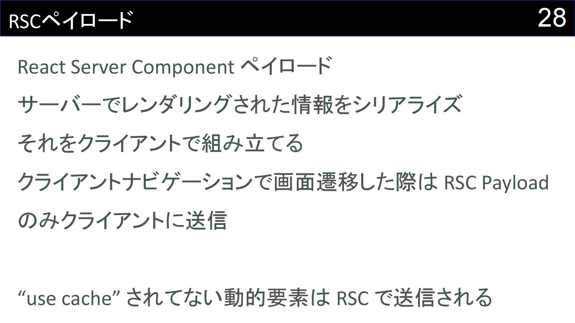 28 RSCペイロード React Server Component ペイロード サーバーでレンダリングされた情報をシリアライズ それをクライアントで組み立てる クライアントナビゲーションで画面遷移した際は RSC