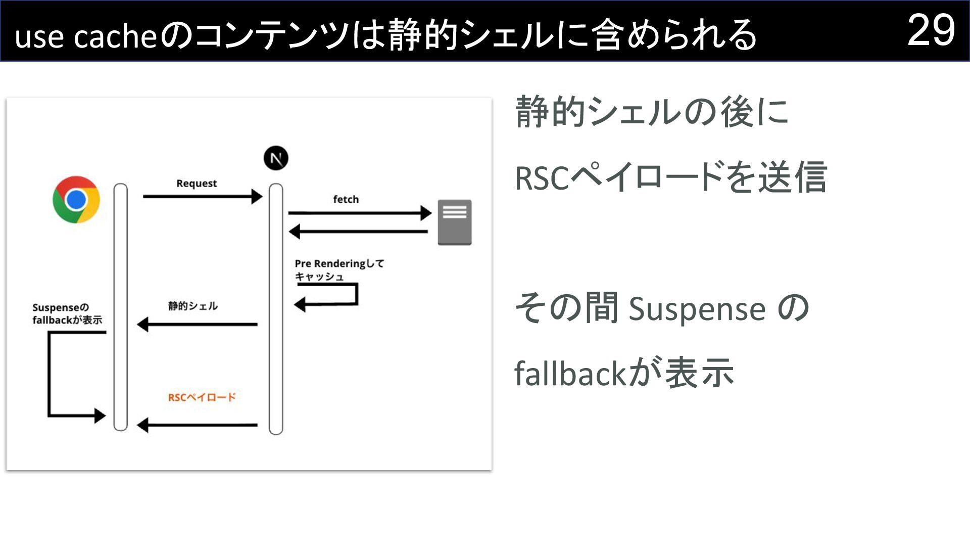 29 use cacheのコンテンツは静的シェルに含められる 静的シェルの後に RSCペイロードを送信 その間 Suspense の fallbackが表示