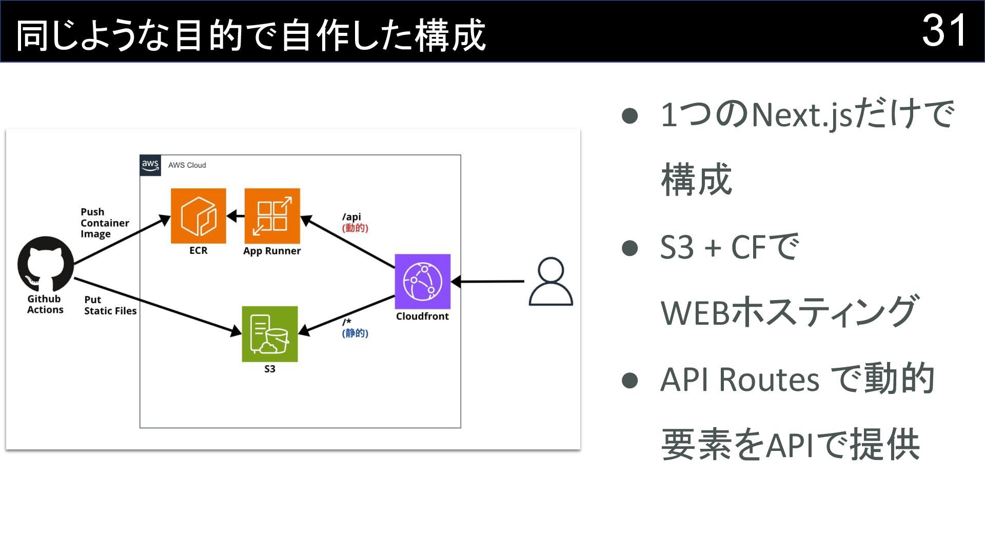 31 同じような目的で自作した構成 • 1つのNext.jsだけで 構成 • S3 + CFで WEBホスティング