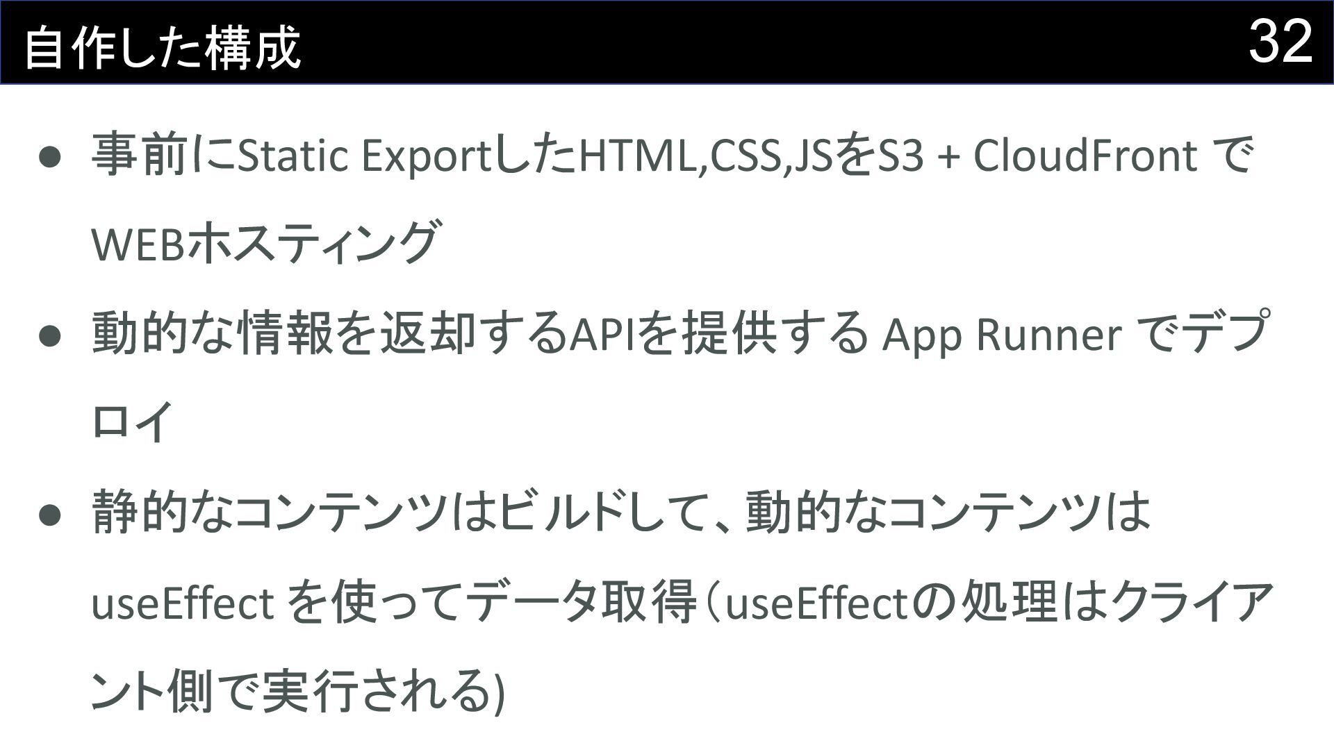 動的な情報を返却するAPIを提供する App Runner でデプ ロイ • 静的なコンテンツはビルドして、動的なコンテンツは useEffect を使ってデータ取得(useEffectの処理はクライア ント側で実行される)