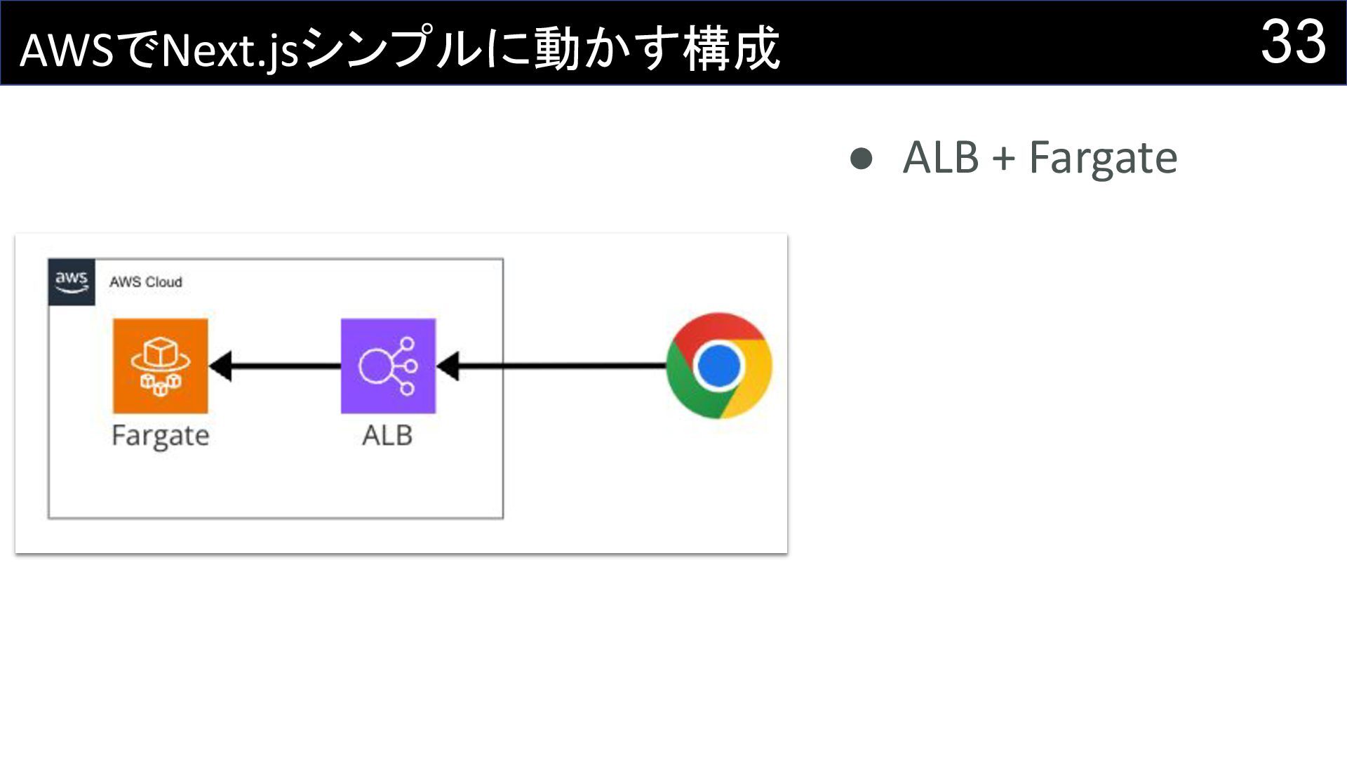 33 AWSでNext.jsシンプルに動かす構成 • ALB + Fargate