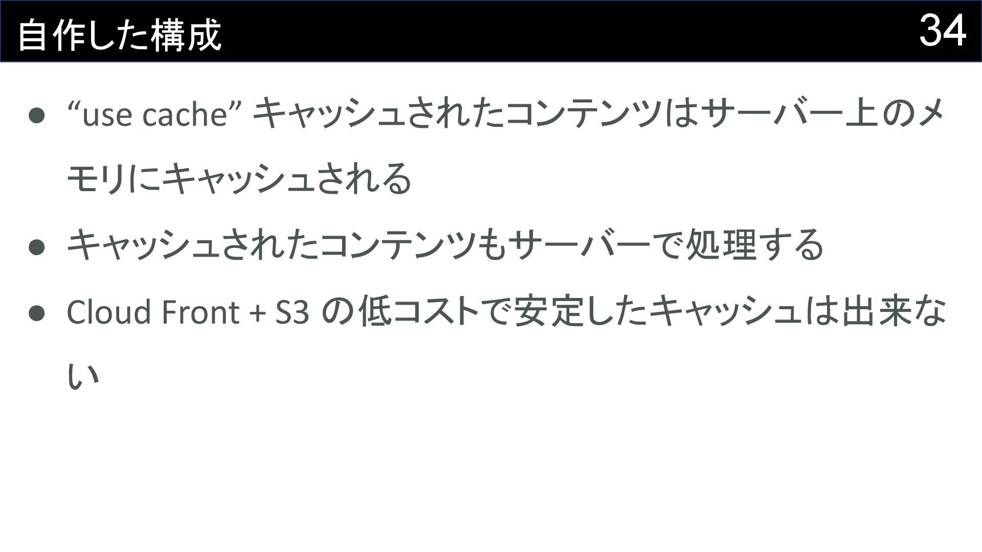 34 自作した構成 • “use cache” キャッシュされたコンテンツはサーバー上のメ モリにキャッシュされる • キャッシュされたコンテンツもサーバーで処理する •