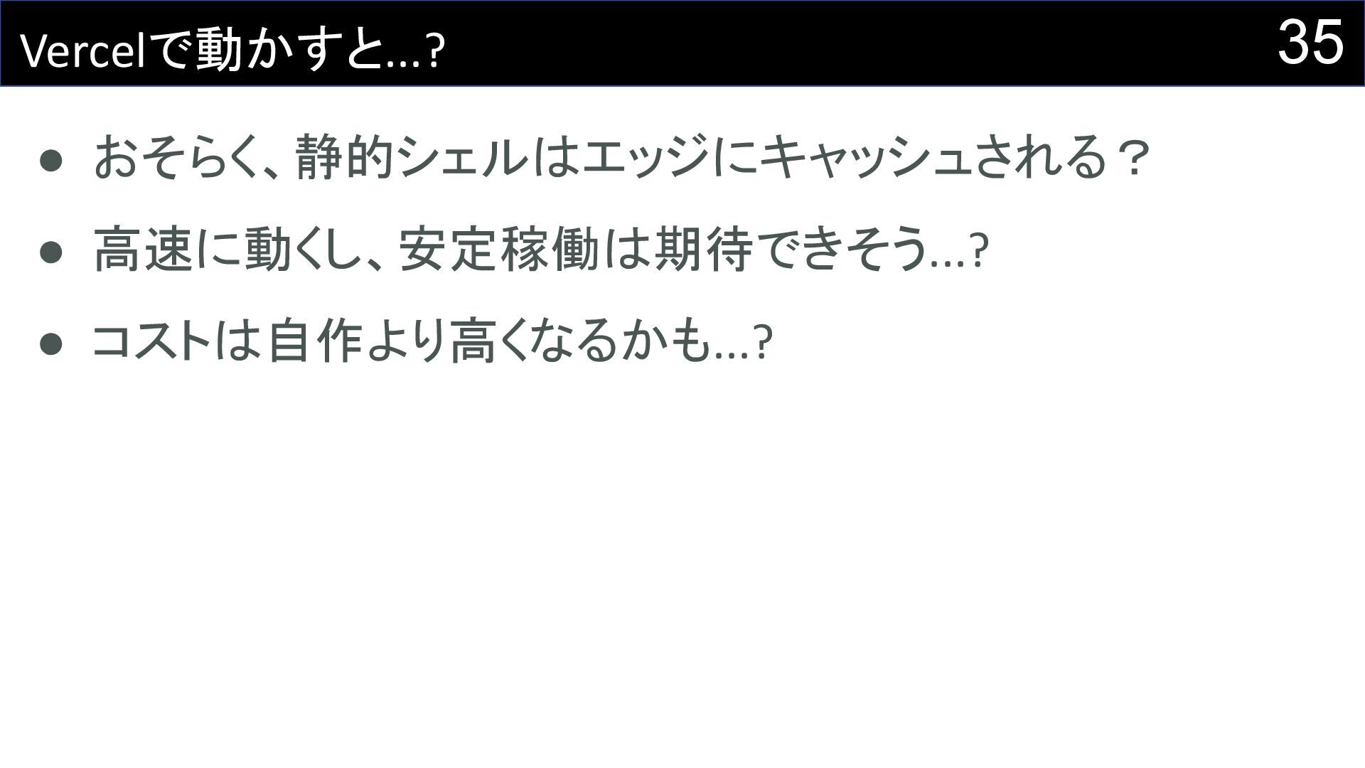 35 Vercelで動かすと...? • おそらく、静的シェルはエッジにキャッシュされる? • 高速に動くし、安定稼働は期待できそう...? • コストは自作より高くなるかも...?