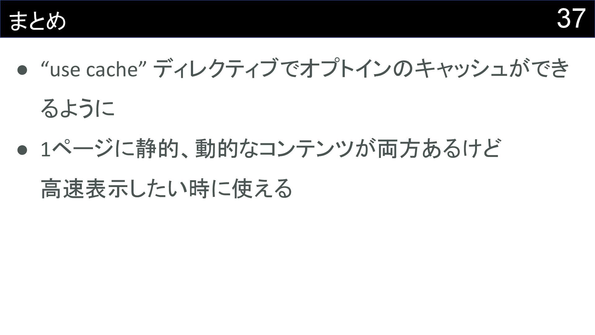 37 まとめ • “use cache” ディレクティブでオプトインのキャッシュができ るように • 1ページに静的、動的なコンテンツが両方あるけど 高速表示したい時に使える