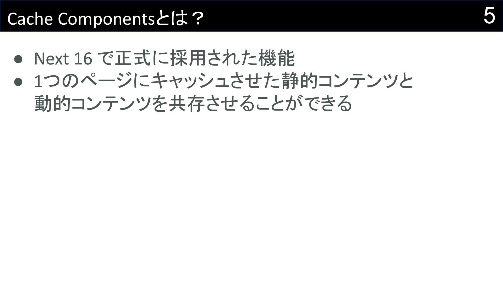 5 Cache Componentsとは? • Next 16 で正式に採用された機能 • 1つのページにキャッシュさせた静的コンテンツと 動的コンテンツを共存させることができる