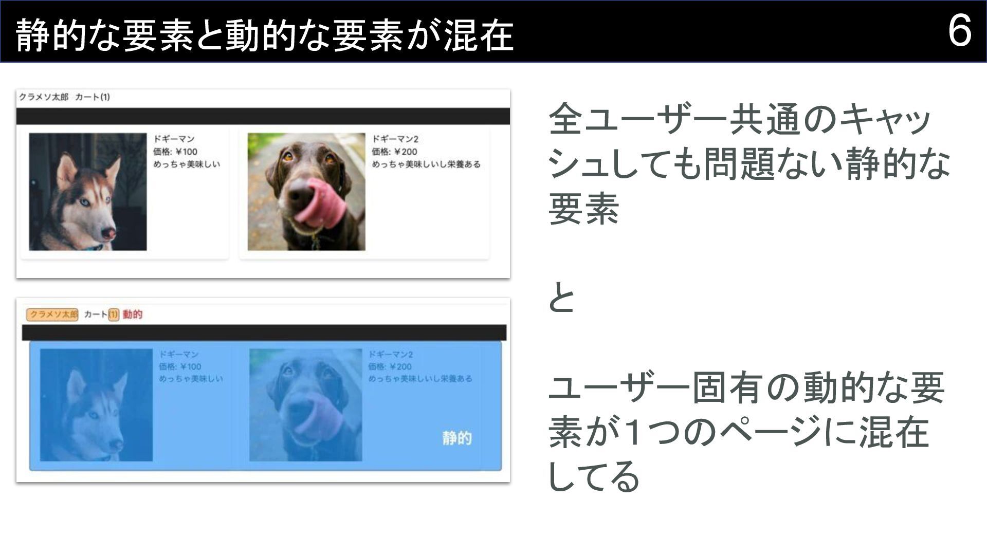 6 静的な要素と動的な要素が混在 全ユーザー共通のキャッ シュしても問題ない静的な 要素 と ユーザー固有の動的な要 素が1つのページに混在 してる