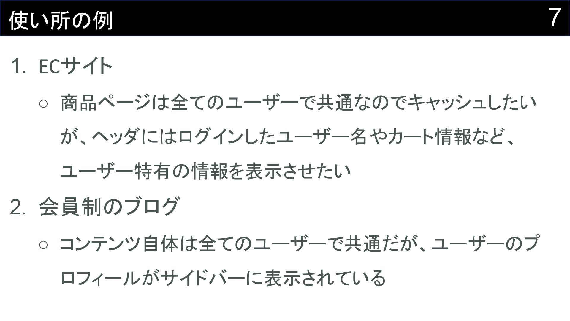 7 使い所の例 1. ECサイト ◦ 商品ページは全てのユーザーで共通なのでキャッシュしたい が、ヘッダにはログインしたユーザー名やカート情報など、 ユーザー特有の情報を表示させたい 2. 会員制のブログ