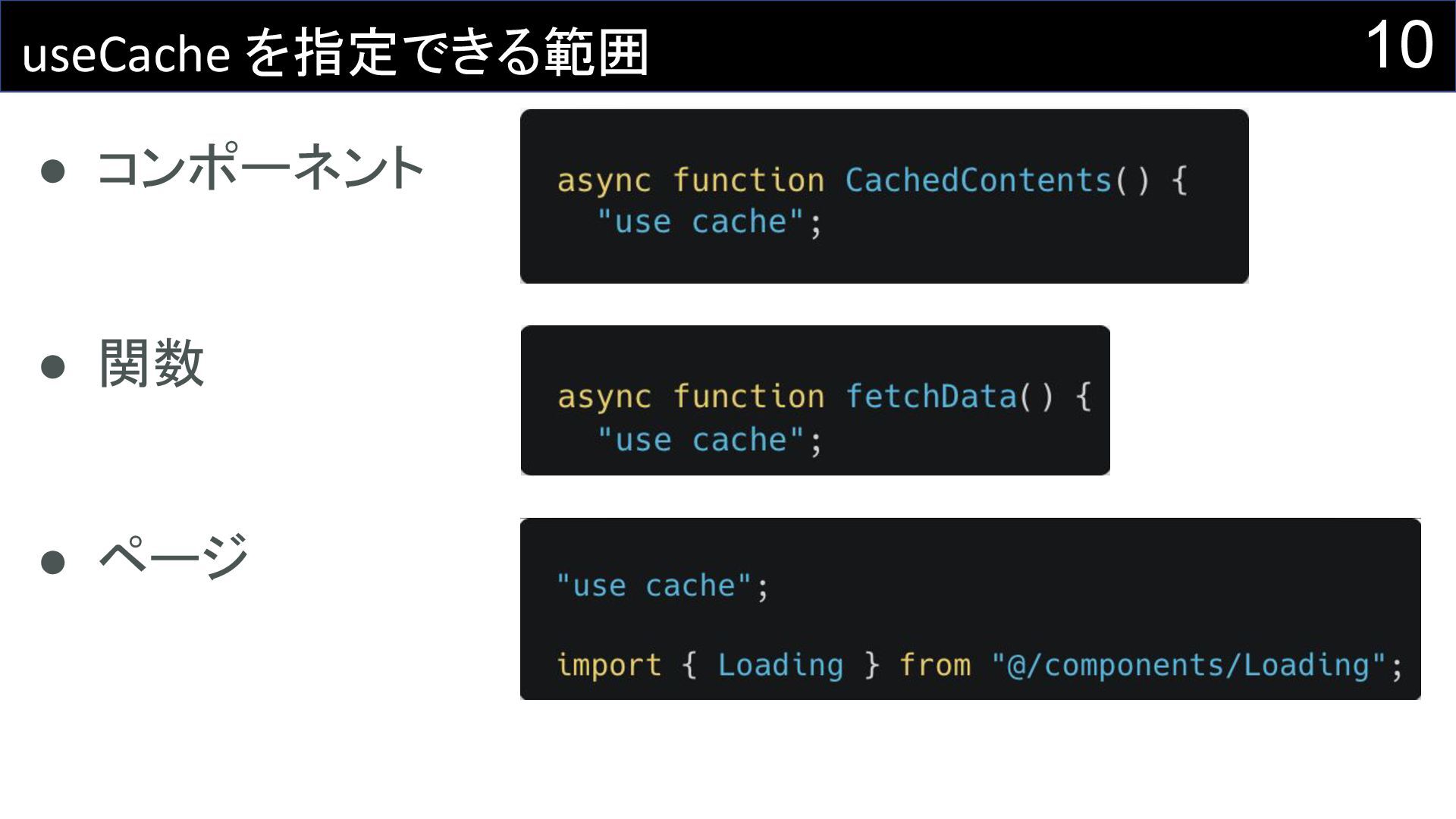 10 useCache を指定できる範囲 • コンポーネント • 関数 • ページ