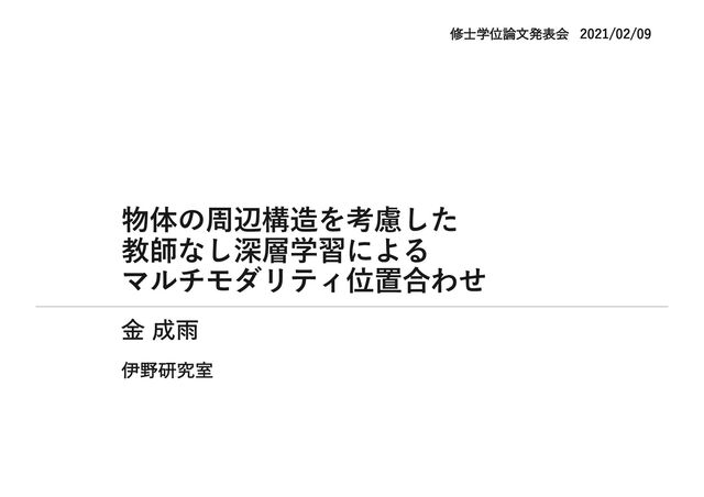 教師なし深層学習による位置合わせ[2] 浮動画像と参照画像間の類似度メトリクスを⽤いて学習する 類似度メトリクスがモダリティに依存するため,マルチモダリティ 間の位置合わせに失敗する l 相互情報量を⽤いた位置合わせ[3] モダリティへの依存が⼩さい類似度メトリクスであり,マルチモダ リティ間の位置合わせに有効 ⼤域的な指標であるため,物体の周辺構造を考慮しない [1] Xi Cheng, Li Zhang, and Yefeng Zheng. Deep similarity learning for multimodal medical images. Computer Methods in Biomechanics and Biomedical Engineering: Imaging & Visualization, pp. 1‒5, April 2016. [2] Guha Balakrishnan, Amy Zhao, Mert R Sabuncu, John Guttag, and Adrian V Dalca. An unsupervised learning model for deformable medical image registration. In Proceedings of the IEEE Conf. Computer Vision and Pattern Recognition, pp. 9252‒9260, 2018. [3] Josien PW Pluim, JB Antoine Maintz, and Max A Viergever. Mutual-informationbased registration of medical images: a survey. IEEE Trans. Medical Imaging, Vol. 22, No. 8, pp. 986‒1004, 2003.