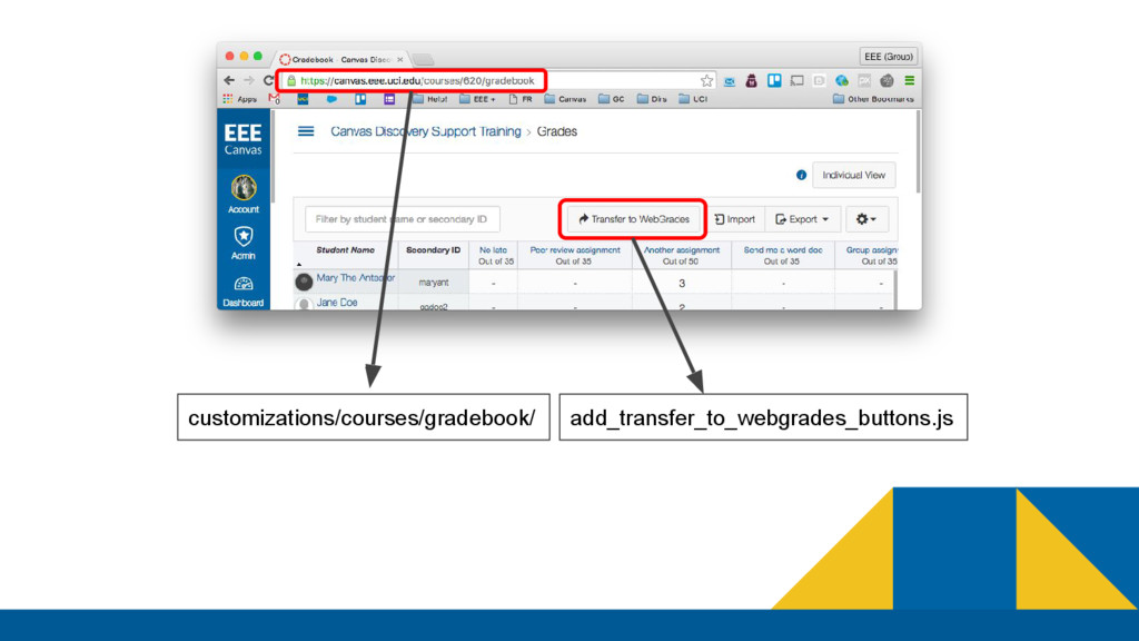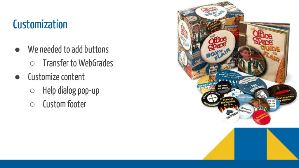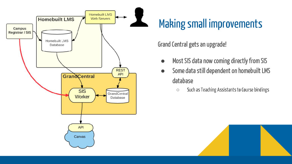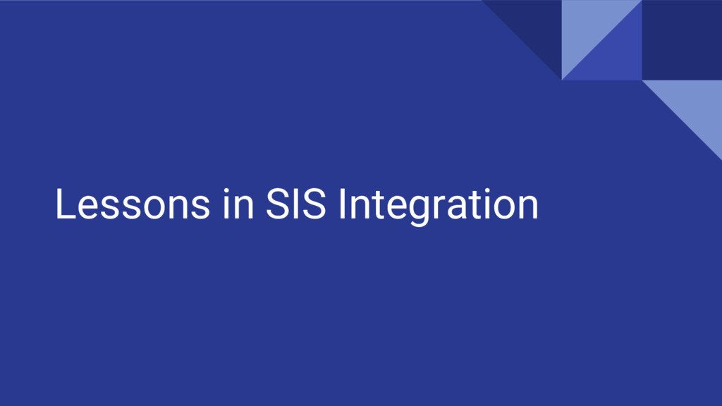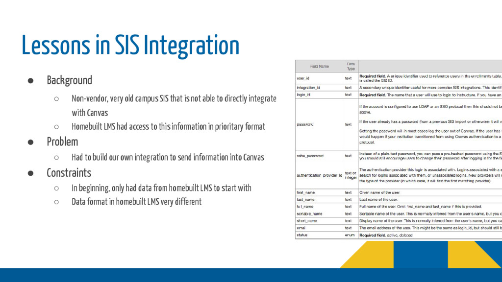 campus SIS that is not able to directly integrate with Canvas ◦ Homebuilt LMS had access to this information in prioritary format • Problem ◦ Had to build our own integration to send information into Canvas • Constraints ◦ In beginning, only had data from homebuilt LMS to start with ◦ Data format in homebuilt LMS very different