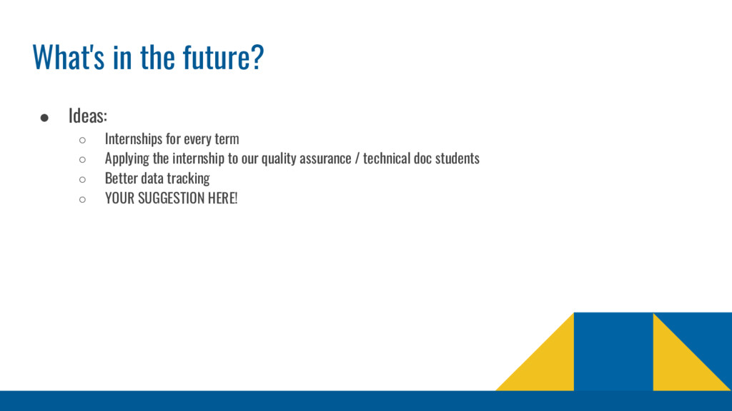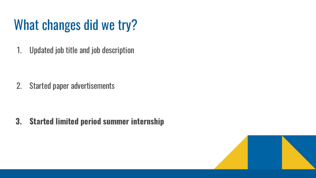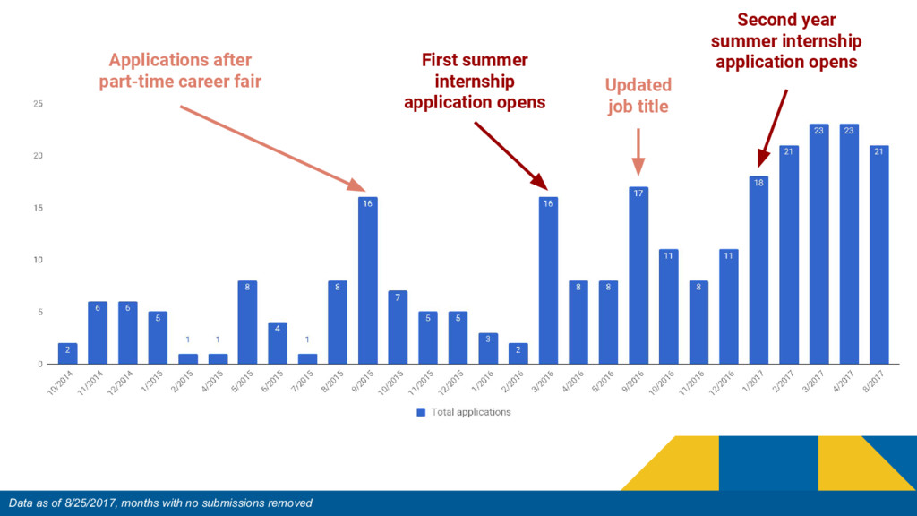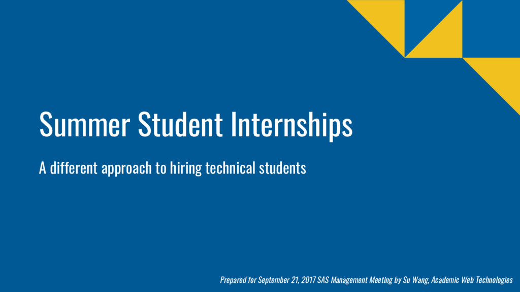 continued into the regular academic year as student developer, eventually became full time staff 2. 2nd year (this year): hired intern, intern will be continuing into the academic year as student developer