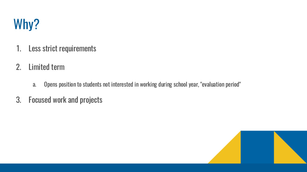 bigger candidate pool, less scary, more applicants from earlier stage in undergraduate education (e.g. 2nd/3rd years) 2. Limited term 3. Focused work and projects