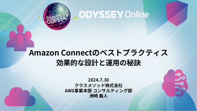 Amazon Connectのベストプラクティス 効果的な設計と運⽤の秘訣 2024.7.30 クラスメソッド株式会社 AWS事業本部 コンサルティング部 洲崎 義⼈