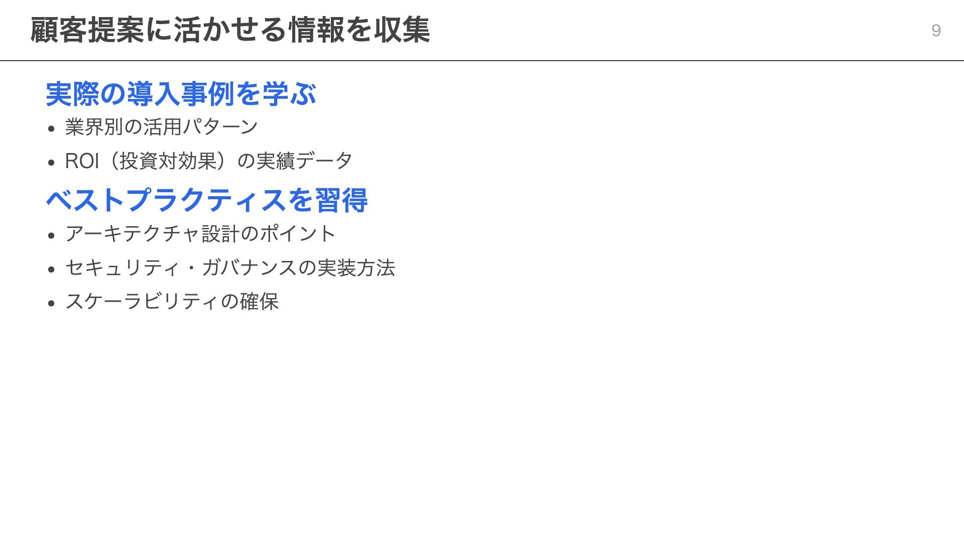 実際の導入事例を学ぶ 業界別の活用パターン ROI(投資対効果)の実績データ ベストプラクティスを習得 アーキテクチャ設計のポイント セキュリティ・ガバナンスの実装方法 スケーラビリティの確保 顧客提案に活かせる情報を収集 9