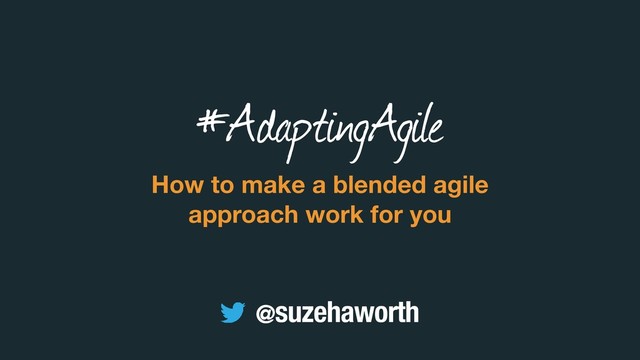 No user testing until we’ve launched the product • Lack of design time means we’re focusing on tech defining the product Frequent delivery: • Despite working in Sprints, we aren’t releasing frequently Team collaboration: • We don’t have the entire team involved from the start of the project Customer first: • I believe that testing designs on customers • For my whole team • Will help us define the correct solution before we start build and help eliminate waste Frequent delivery: • I believe that reviewing the release process and uncovering blockers • For my developers • Will help us to release more frequently #AdaptingAgile @suzehaworth
