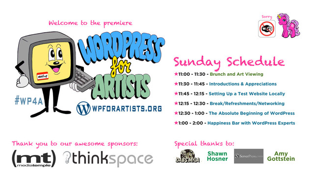 11:45 - Introductions & Appreciations ★11:45 - 12:15 - Setting Up a Test Website Locally ★12:15 - 12:30 - Break/Refreshments/Networking ★12:30 - 1:00 - The Absolute Beginning of WordPress ★1:00 - 2:00 - Happiness Bar with WordPress Experts Shawn Hosner Amy Gottstein Welcome to the premiere Sunday Schedule Special thanks to: Thank you to our awesome sponsors: Sorry