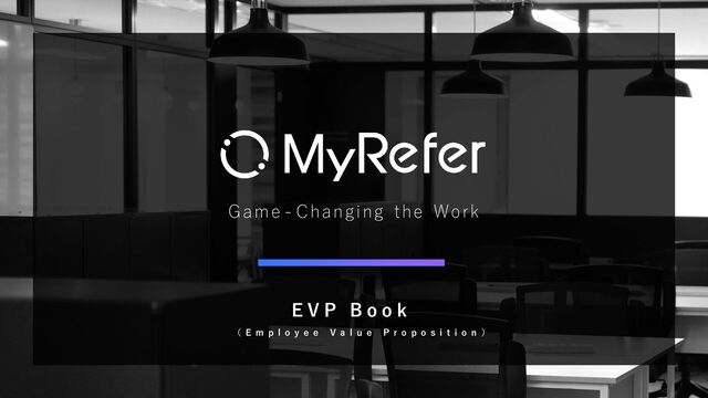u r p o s e ▪ V i s i o n ▪ M a r k e t ▪ Va l u e ( 1 0 L e a d e r s h i p P r i n c i p l e ) ▪ Product / Service ▪ I n d i v i d u a l ▪ E n v i r o n m e n t ・HRTech事業 ・採用マーケティング支援事業 ・エンゲージメント支援事業 Myシリーズの提供 ・MyRefer ・MyTalent ・MyXXX ・MyXXX ・MVP/バリュー表彰制度 ・Willキャリ ・粋TAI ・My-design Professionalism Respect everyone Essential thinking Teamplay enjoy working 6. 7. 8. 9. 10. UserFirst Bold mistake be Columbus be Ownership Gale 1. 2. 3. 4. 5. 人と組織のポテンシャルを 解放する社会の創造 未来のインフラを創出し、 HRの歴史を塗り替える。 安定的な成長ではなく、『激しく、変化しながら成長する。』 ▪ S t a n c e