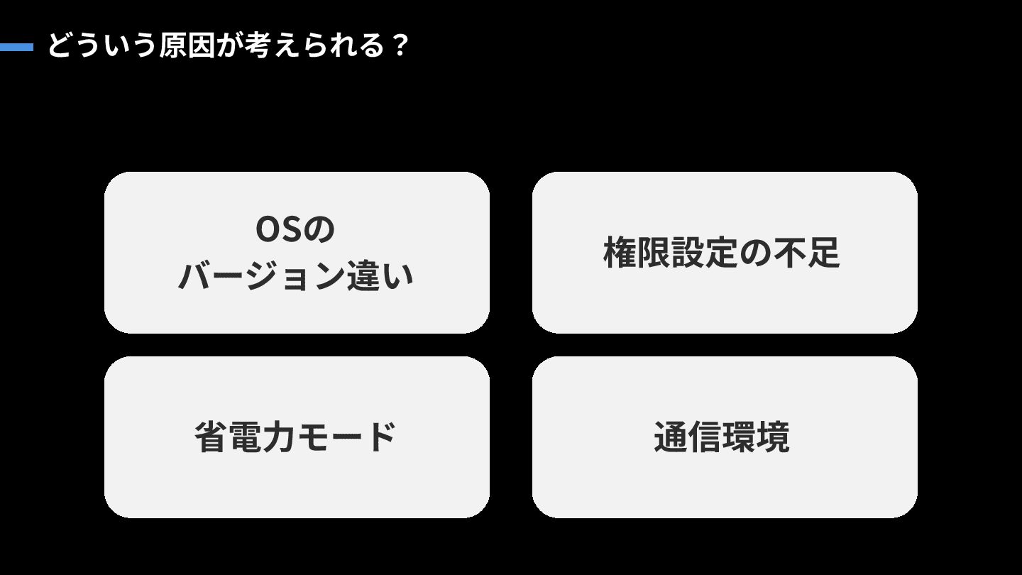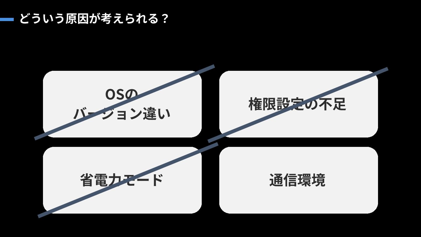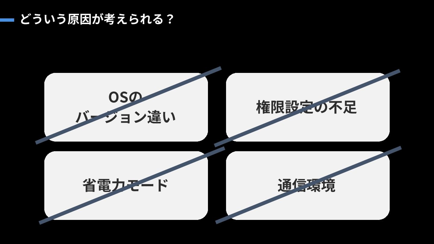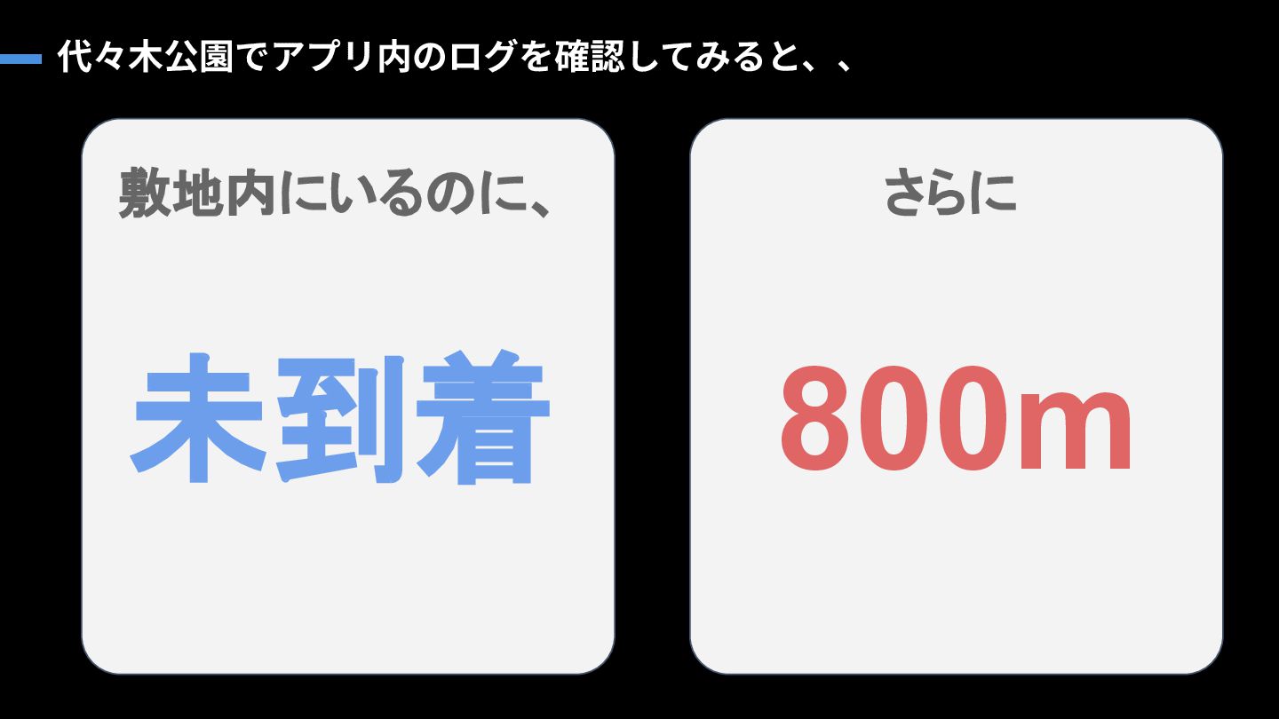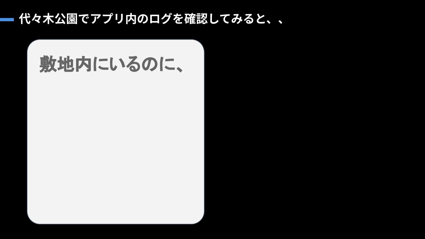 まさか、そんなはずは...。慌てて現地に向かい検証すると、確かに公園内部で全く反応しません。一方で、同じコードを使ったジムでは相変わらず正常動作。