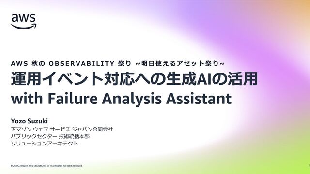 rights reserved. Yozo Suzuki アマゾン ウェブ サービス ジャパン合同会社 パブリックセクター 技術統括本部 ソリューションアーキテクト 運⽤イベント対応への⽣成AIの活⽤ with Failure Analysis Assistant AW S 秋 の O B S E R VA B I L I T Y 祭 り ~ 明 ⽇ 使 え る ア セ ッ ト 祭 り ~ 1