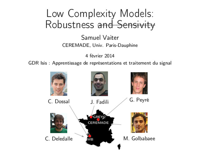 Paris-Dauphine 4 février 2014 GDR Isis : Apprentissage de représentations et traitement du signal J. Fadili G. Peyré C. Dossal M. Golbabaee C. Deledalle IMB GREYC CEREMADE