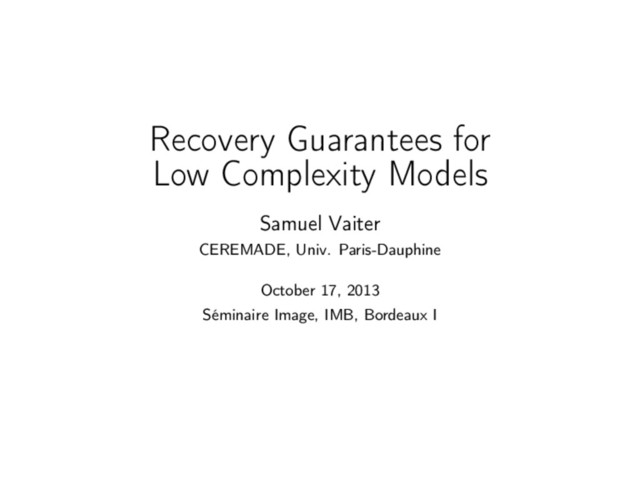 et G. Peyré, Model Selection with Piecewise Regular Gauges, Tech. report, http://arxiv.org/abs/1307.2342 , 2013 • J. Fadili, V. and G. Peyré, Linear Convergence Rates for Gauge Regularization, ongoing work