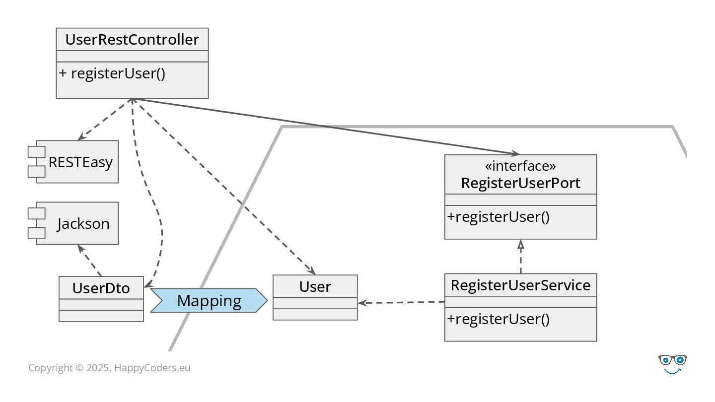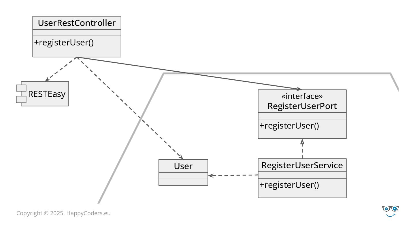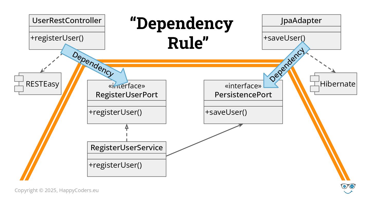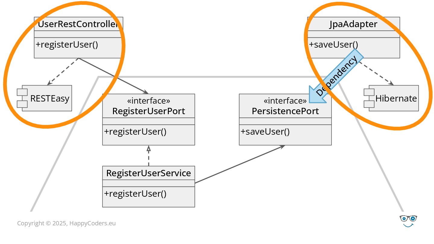 Hexagonale Architektur rückt die Geschäftslogik ins Zentrum, und technische Details werden als Adapter hinter Schnittstellen (Ports) isoliert. Fachlicher und technischer Code kann so unabhängig voneinander entwickelt und getestet werden.