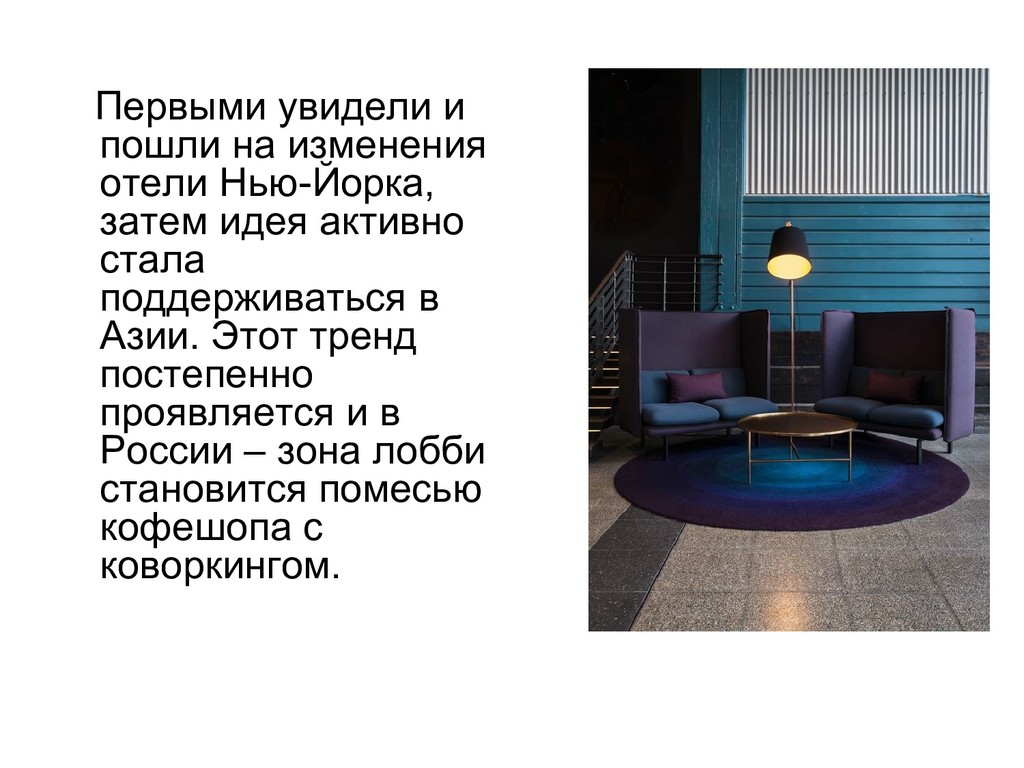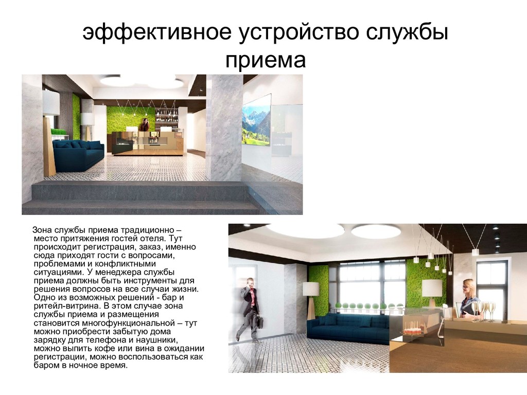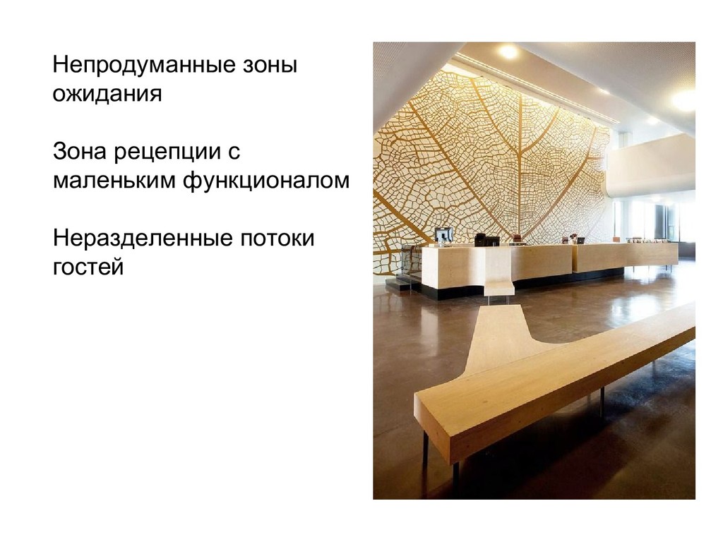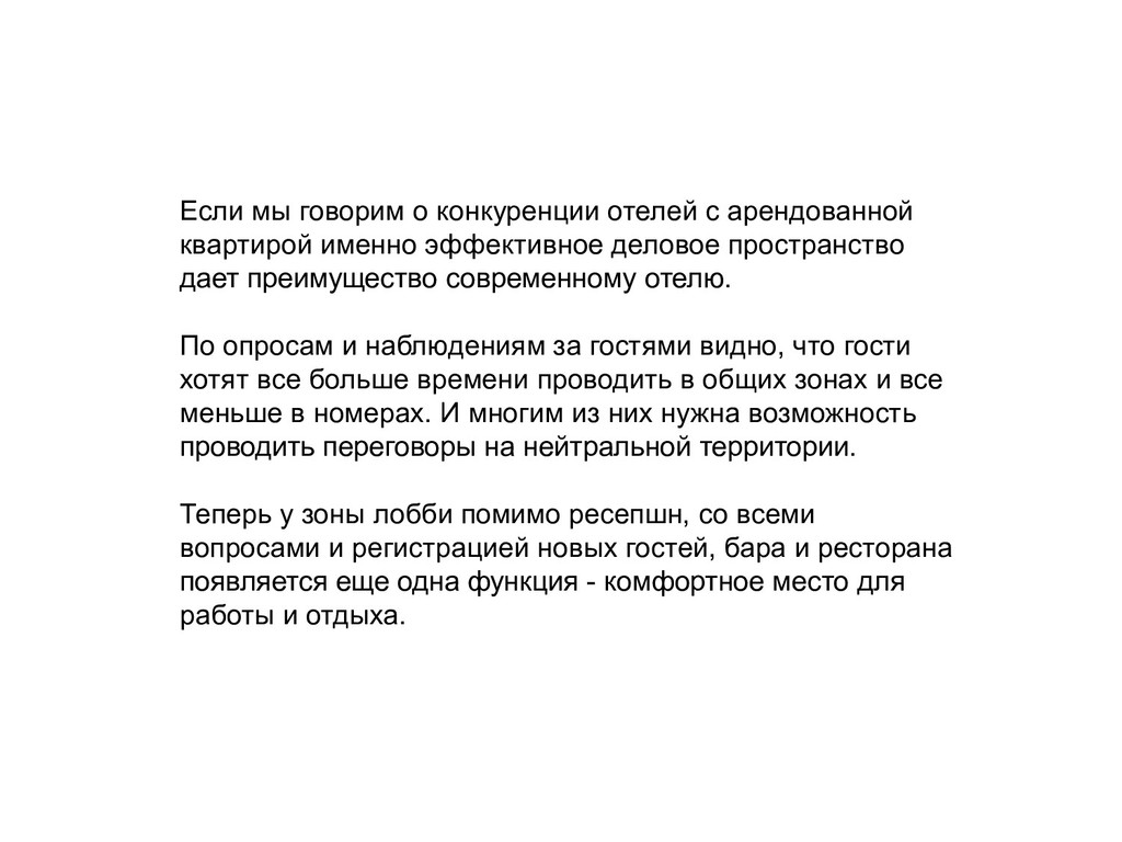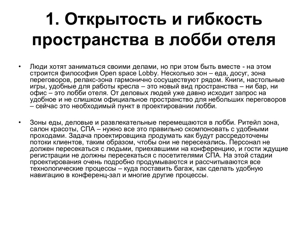 хотят заниматься своими делами, но при этом быть вместе - на этом строится философия Open space Lobby. Несколько зон – еда, досуг, зона переговоров, релакс-зона гармонично сосуществуют рядом. Книги, настольные игры, удобные для работы кресла – это новый вид пространства – ни бар, ни офис – это лобби отеля. От деловых людей уже давно исходит запрос на удобное и не слишком официальное пространство для небольших переговоров – сейчас это необходимый пункт в проектировании лобби. • Зоны еды, деловые и развлекательные перемещаются в лобби. Ритейл зона, салон красоты, СПА – нужно все это правильно скомпоновать с удобными проходами. Задача проектировщика продумать как будут рассредоточены потоки клиентов, таким образом, чтобы они не пересекались. Персонал не должен пересекаться с людьми, приехавшими на конференцию, и гости ждущие регистрации не должны пересекаться с посетителями СПА. На этой стадии проектирования очень подробно продумываются и рассчитываются все технологические процессы – куда поставить багаж, как сделать удобную навигацию в конференц-зал и многие другие процессы.