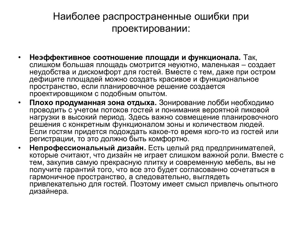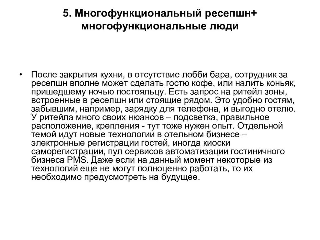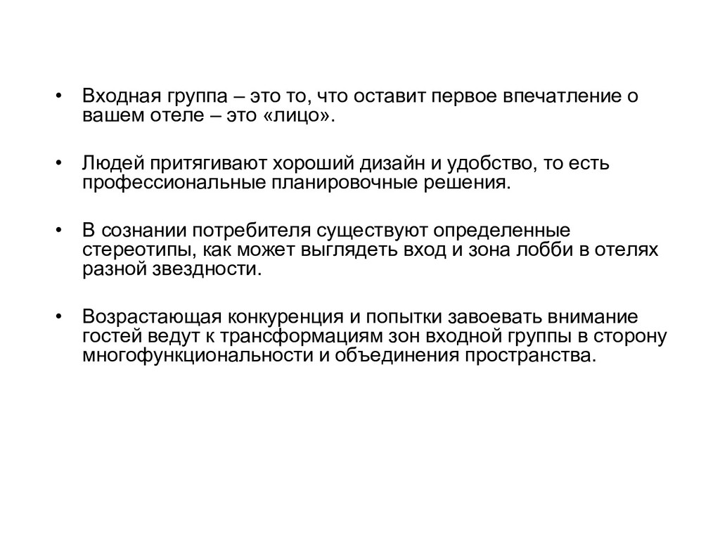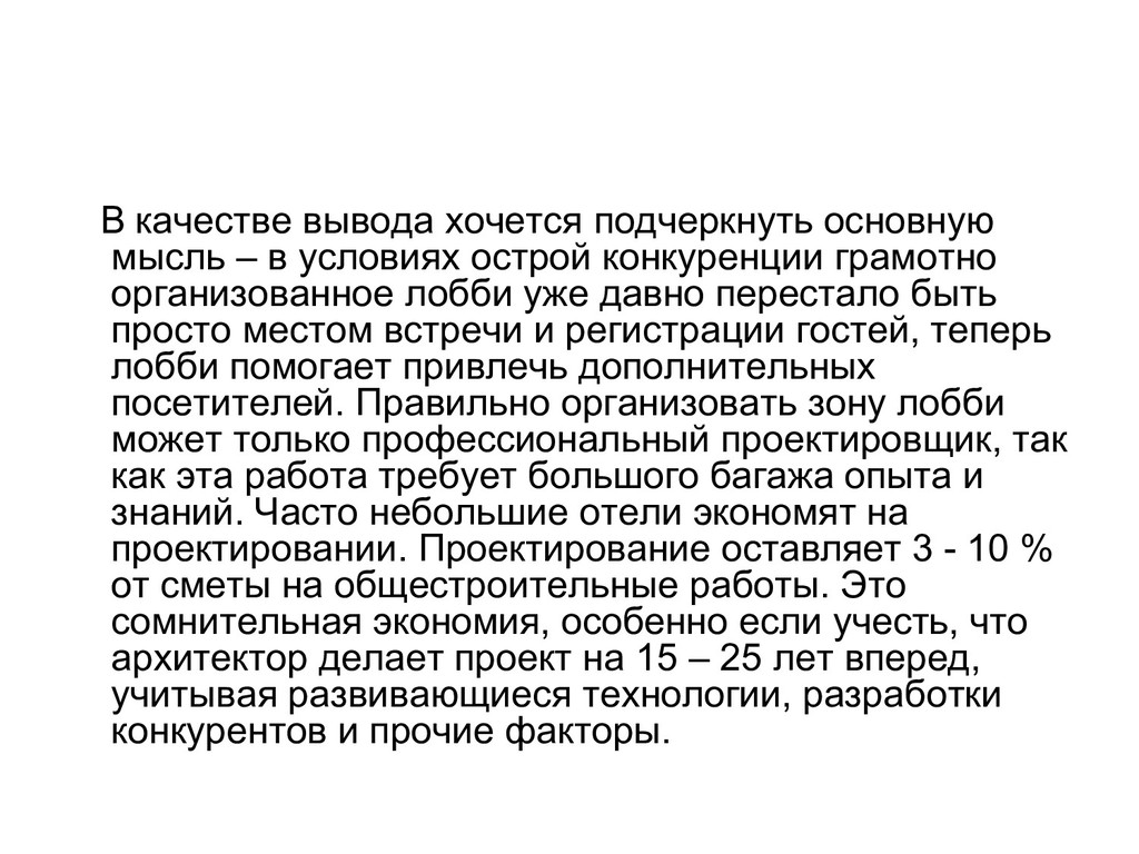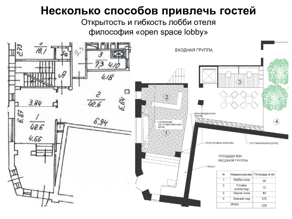 хотят заниматься своими делами, но при этом быть вместе - на этом строится философия Open space Lobby. Несколько зон – еда, досуг, зона переговоров, релакс-зона гармонично сосуществуют рядом. Книги, настольные игры, удобные для работы кресла – это новый вид пространства – ни бар, ни офис – это лобби отеля. От деловых людей уже давно исходит запрос на удобное и не слишком официальное пространство для небольших переговоров – сейчас это необходимый пункт в проектировании лобби. • Зоны еды, деловые и развлекательные перемещаются в лобби. Ритейл зона, салон красоты, СПА – нужно все это правильно скомпоновать с удобными проходами. Задача проектировщика продумать как будут рассредоточены потоки клиентов, таким образом, чтобы они не пересекались. Персонал не должен пересекаться с людьми, приехавшими на конференцию, и гости ждущие регистрации не должны пересекаться с посетителями СПА. На этой стадии проектирования очень подробно продумываются и рассчитываются все технологические процессы – куда поставить багаж, как сделать удобную навигацию в конференц-зал и многие другие процессы.
