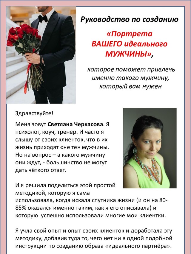 встретить своего «Принца на белом мерседесе». И при этом кроме каких-то очень общих представлений, они совершенно не представляют, какой мужчина им нужен и действительно подходит. И тогда часто бывает так: вы встретились, понравились друг другу, начали вместе жить, а потом… поняли, что общего у вас мало: ни ценности, ни цели в жизни, ни желания не совпадают... И тогда оба в паре начинают мучиться: вроде бы уже привязались друг к другу, а жить вместе и строить отношения – невероятно трудно. Если же вы заранее хорошо представляете себе, кого именно вы хотите встретить, - то, во-первых, - Вселенная в разы усилит ваше намерение, и подходящие мужчины начнут как из «рога изобилия» приходить в вашу жизнь. А, во-вторых, - вам гораздо проще будет, на самых ранних этапах знакомства, разобраться, - тот ли это человек перед вами и стоит ли продолжать общение с ним. 2
