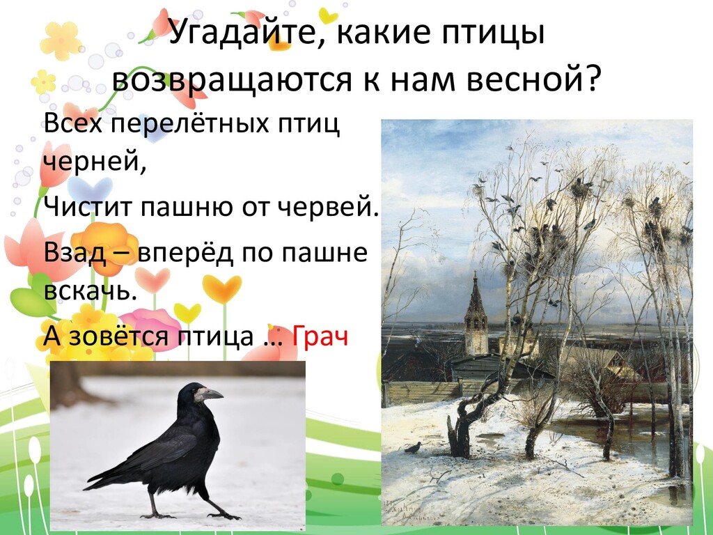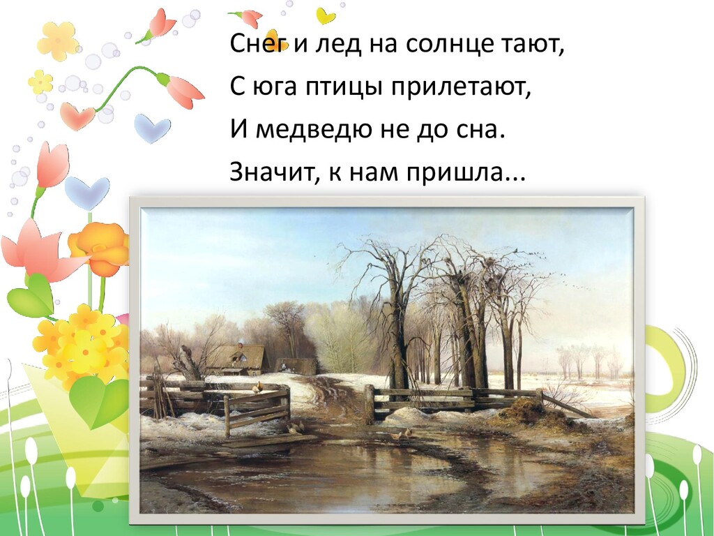 горней вышины! Старой спорить ли, тщедушной, С ней – царицею цветов, С целой армией воздушной Благовонных ветерков! А что шума, что гуденья, Теплых ливней и лучей, И чиликанья, и пенья!.. Уходи себе скорей! У нее не лук, не стрелы, Улыбнулась лишь – и ты, Подобрав свой саван белый, Поползла в овраг, в кусты!.. Да найдут и по оврагам! Вон – уж пчел рои шумят, И летит победным флагом Пестрых бабочек отряд! (А. Майков)