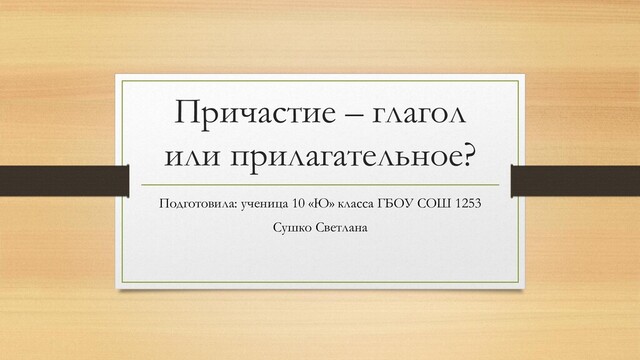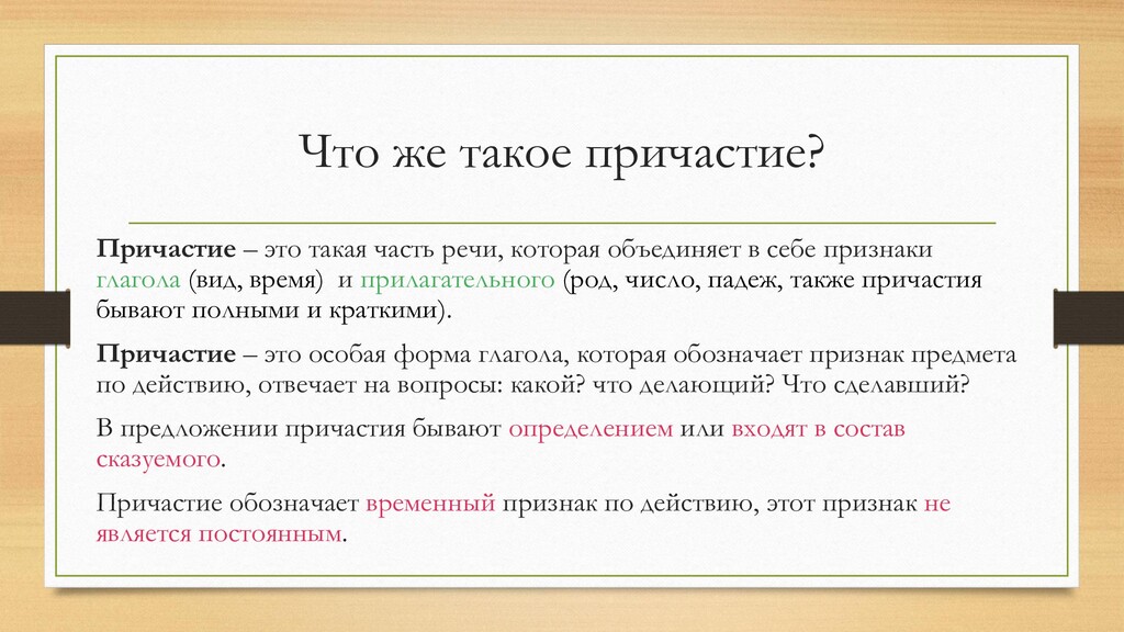и й 2 в е р у ю щ и й 3 в о с п и т а н н а 4 у в е н ч а н 5 г л а г о л 6 ч и с л о 7 з а б ы т ы й 8 в и д 9 п а д е ж 1. Идущий, крадущий, пришедший. Найдите причастие в прошедшем времени. 2. Пришедший, вспомнивший, верующий. Найдите причастие в настоящем времени. 3. Представьте причастие «воспитанная» в краткой форме. 4. Увенчан, думающий, увидевший. Найдите причастие, которое НЕ склоняется. 5. От какой части речи причастие имеет вид и время? 6. Бывает множественное и единственное… 7. Забытый мною ключ лежал на столе. Дверь была закрыта на ключ. Сидящий никак не отреагировал на мою просьбу. Найдите причастие, выступающее в роли определения. 8. Что от глагола есть у причастия? 9. По чему изменяется причастие?