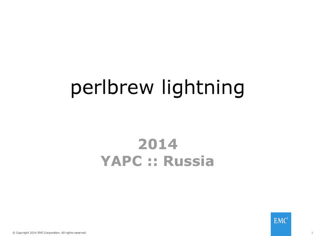 Copyright 2014 EMC Corporation. All rights reserved. Цель • CI процессы (тестирование “продукта”) • Много типов поддерживаемых систем ~ бинарно не совместимых • Желание иметь единую среду! – Желание иметь perl-x.y.z (e.g. 5.18.2) – Желание кое-что бандлить (~sitecustomize : биндинги к ESX API…) => “perlembed наоборот” !