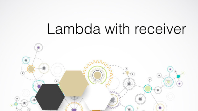 (sb) { this.appendln(“Alphabet: ") for (c in 'a'..'z') { this.append(c) } this.toString() } val sb = StringBuilder() with (sb, { -> this.appendln(“Alphabet: ") for (c in 'a'..'z') { this.append(c) } this.toString() }) lambda is its second argument Lambda with receiver with is a function this is an implicit receiver in the lambda val sb = StringBuilder() with (sb) { appendln("Alphabet: ") for (c in 'a'..'z') { append(c) } toString() } this can be omitted