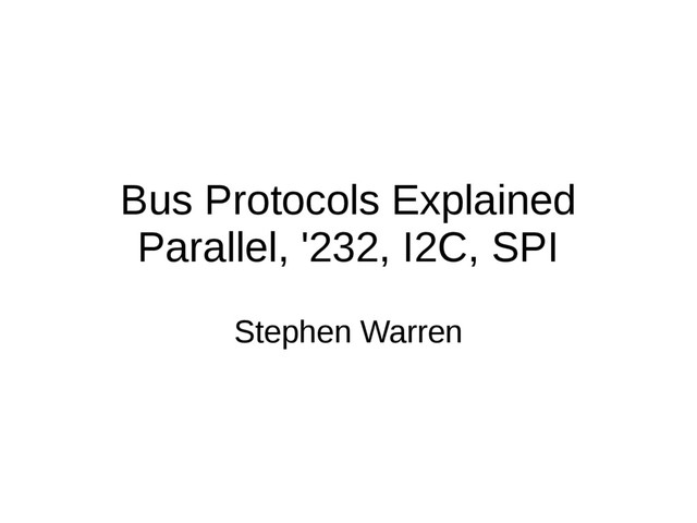 In order to connect devices (e.g. RGB LED, temperature sensor, ...) to your microcontroller (e.g. Arduino, ARM board, ESP8266), you'll need to use some kind of bus. Come and learn about how some common types of bus work. I'll cover at least I2C and SPI, and perhaps others such as RS-232, parallel, etc.