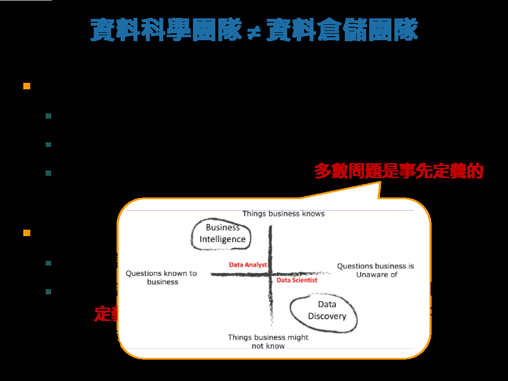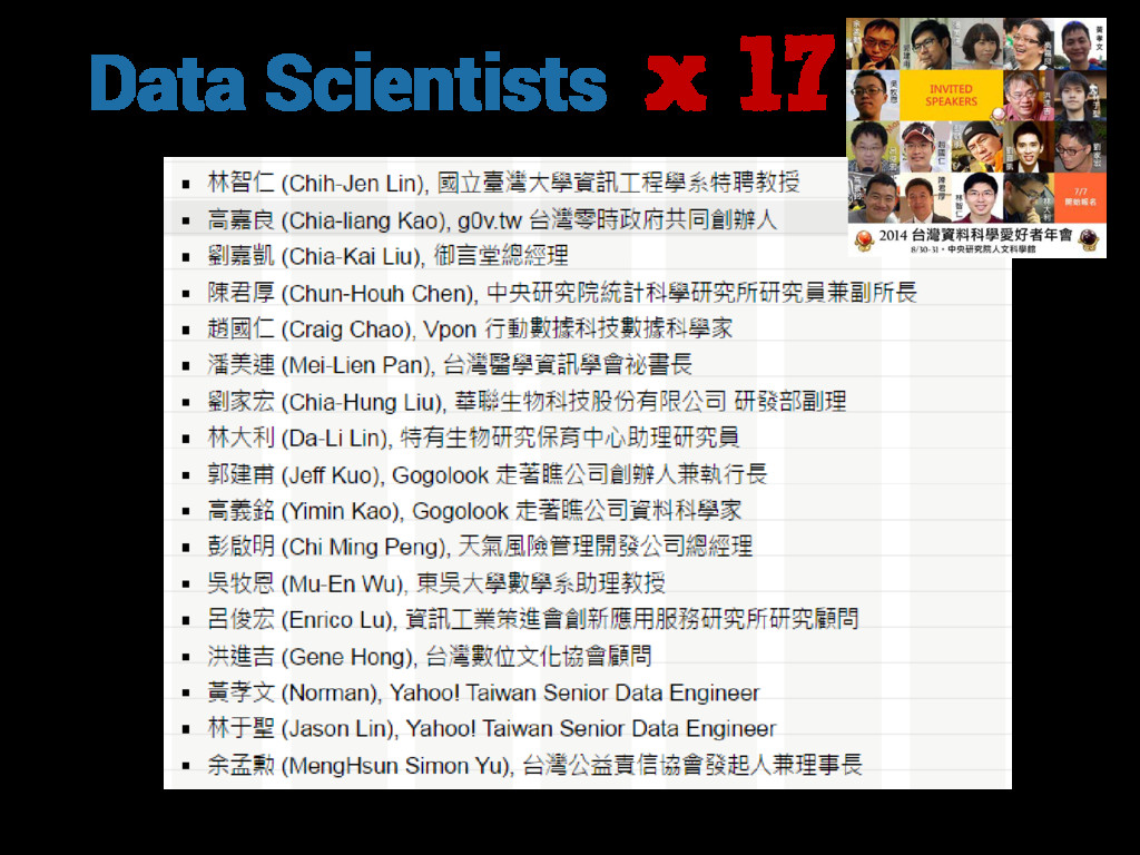 在此演講中,我將為聽眾闡明資料科學、大數據、人工智慧、機器(深度)學習、資料探勘等相近但又不同的詞彙,再以各領域的實際案例來分享資料的可能應用及實用價值。同時,我將與聽眾分享其協助多家企業培訓資料科學家及導入資料科學團隊的各種經驗,從企業如何跳脫既有框架,讓資料科學團隊盡情揮灑無限創意著手,進而能活用資料、挖掘出潛藏在資料中不為人知的秘密,最終打造高信任度及高效率的工作環境,展現資料分析的價值。