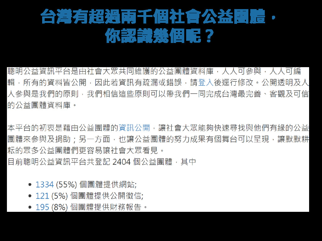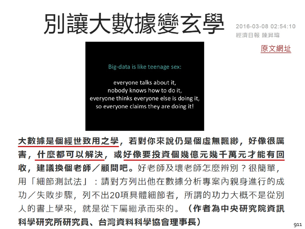 大數據在台灣蔚為風潮,無論是政府官員或販夫走卒,人人皆聽聞大數據的威力。因此,產業界及各級政府皆努力建置所謂的大數據平台,以蒐羅及保存資料為己任,並導入資料的視覺分析工具,讓決策者們能夠快速地查看管理或施政成效,以客觀數據來輔助主觀評價,以分析輔助經驗,以事實取代臆測。